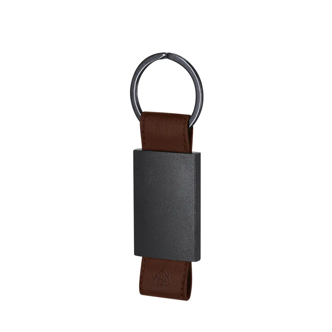 Llavero de divertido diseño con cinta de PU reciclado. Con cuerpo negro en acabado mate.