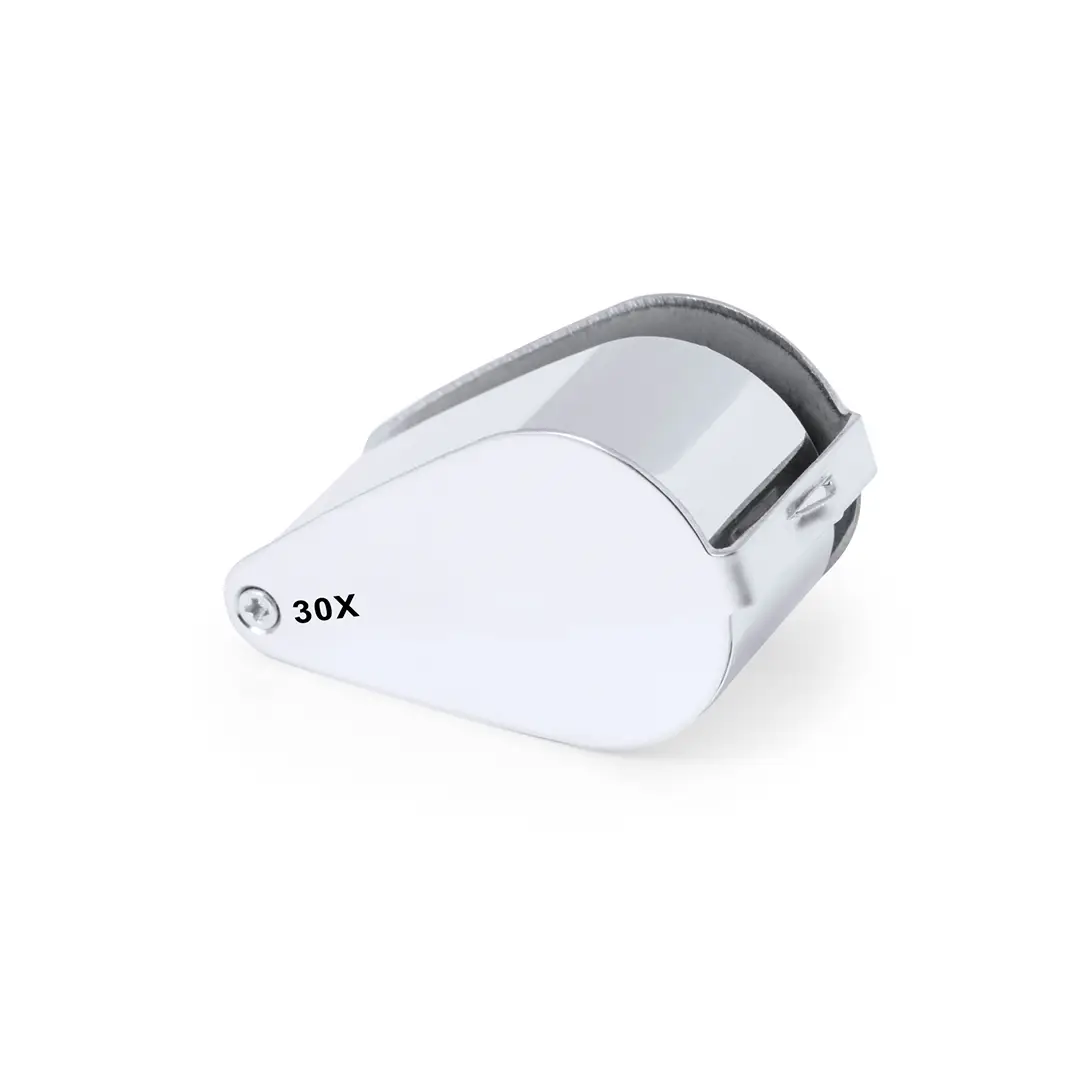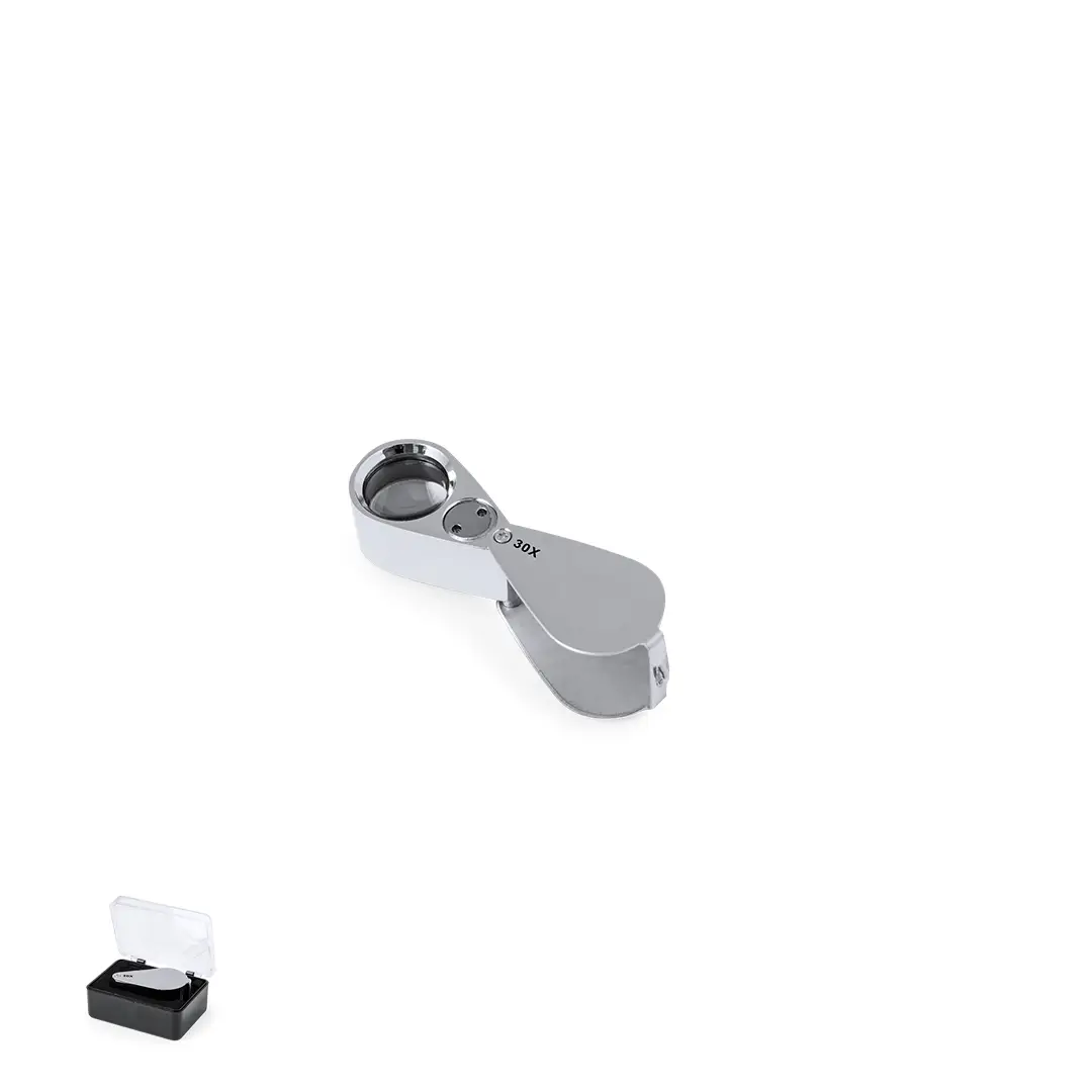 Lupa plegable con aumento 30x fabricada en resistente metal. Con luces LED integradas y gran potencia de aumento para obtener una visión muy cercana de los detalles más pequeños, con ampliación sin distorsión. Ideal para inspeccionar objetos de tamaño reducido, textos, etc. Además, tiene un accesorio para colgar, y viene dentro de un estuche con interior acolchado para una mayor protección. Alimentación a pilas (de botón incluidas), con llave especial para reemplazarlas cuando se agoten. Presentada en caja de cartón negra.