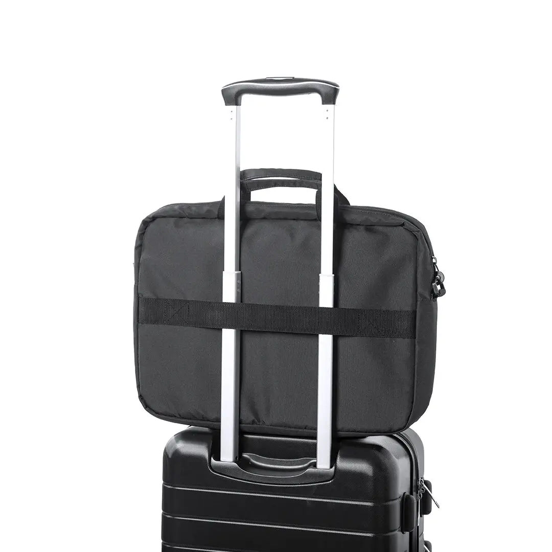 Maletín de línea nature con diseño urbano y acolchado total. Fabricado en resistente RPET 300D elaborado a partir de plástico reciclado, para así fomentar la reutilización de residuos plásticos y contribuir a la sostenibilidad del planeta. Accesorio para ajuste en trolley, con compartimento interior acolchado para ordenador portátil de hasta 15 pulgadas. Bolsillo principal con cierre de cremallera y tirador metálico. Cómodas asas de transporte reforzadas y cinta bandolera ajustable, con refuerzo acolchado para hombro y cierres giratorios de mosquetón. Distintivo RPET en etiqueta.