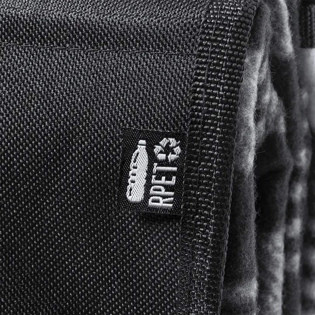 Manta de picnic de calidad premium, fabricada en poliéster RPET de 160g/m2, elaborado a partir de plástico reciclado para así fomentar la reutilización de residuos plásticos y contribuir a la sostenibilidad del planeta. Medidas 120x150cm, con lado para sentarse en patrón tartán bicolor de suave tacto. Lado en contacto con el suelo en resistente PEVA. De fácil plegado y de tamaño compacto, incluye asa de transporte y solapa con cierre de velcro, con distintivo RPET en etiqueta.