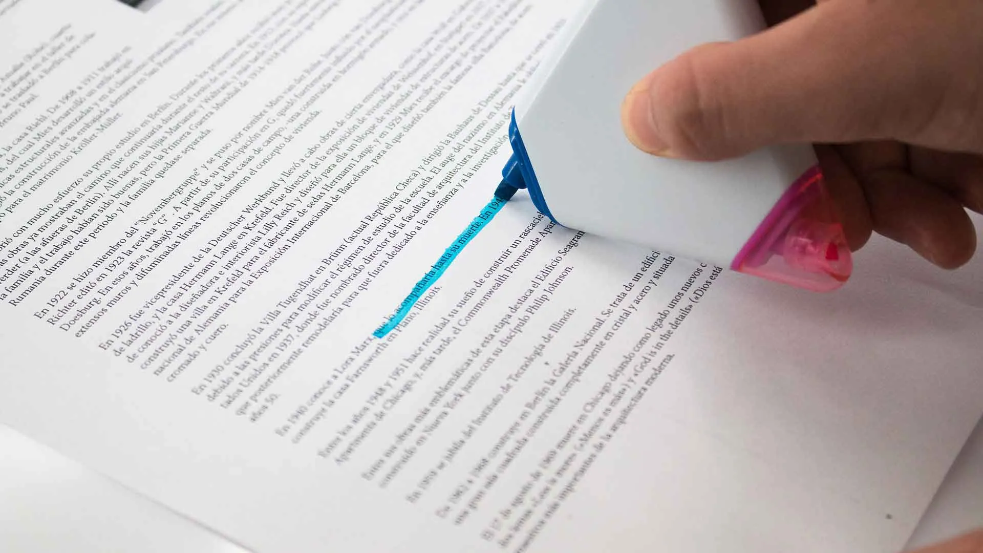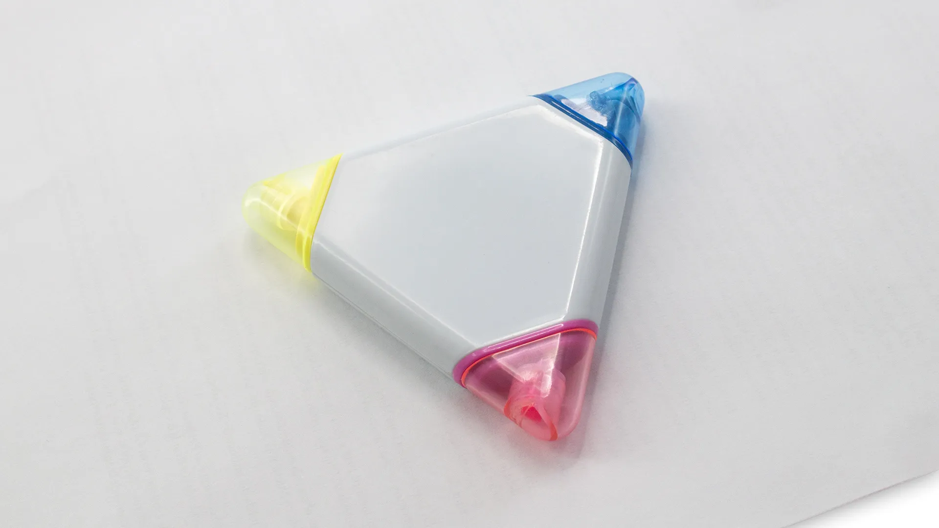 Original marcador fluorescente de tres colores con cuerpo triangular en suave acabado brillante de color blanco, especialmente diseñado para marcaje digital a todo color. Con capuchas translúcidas juego con marcador.