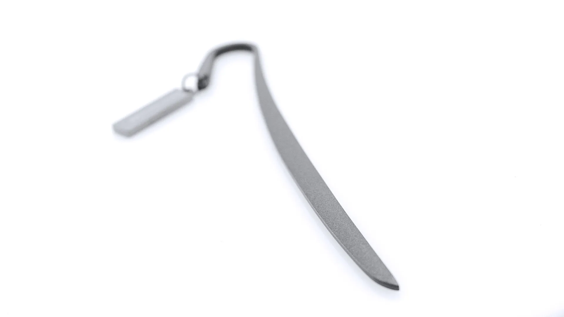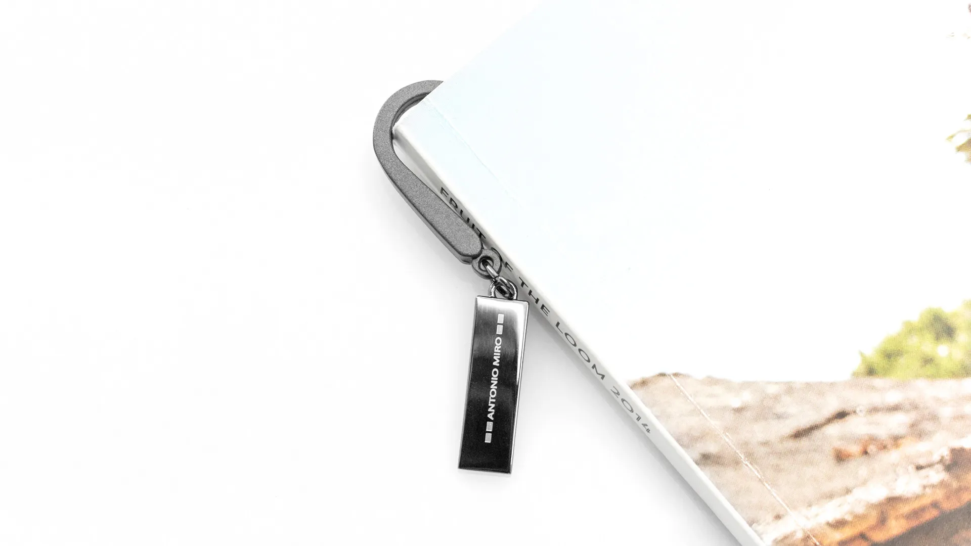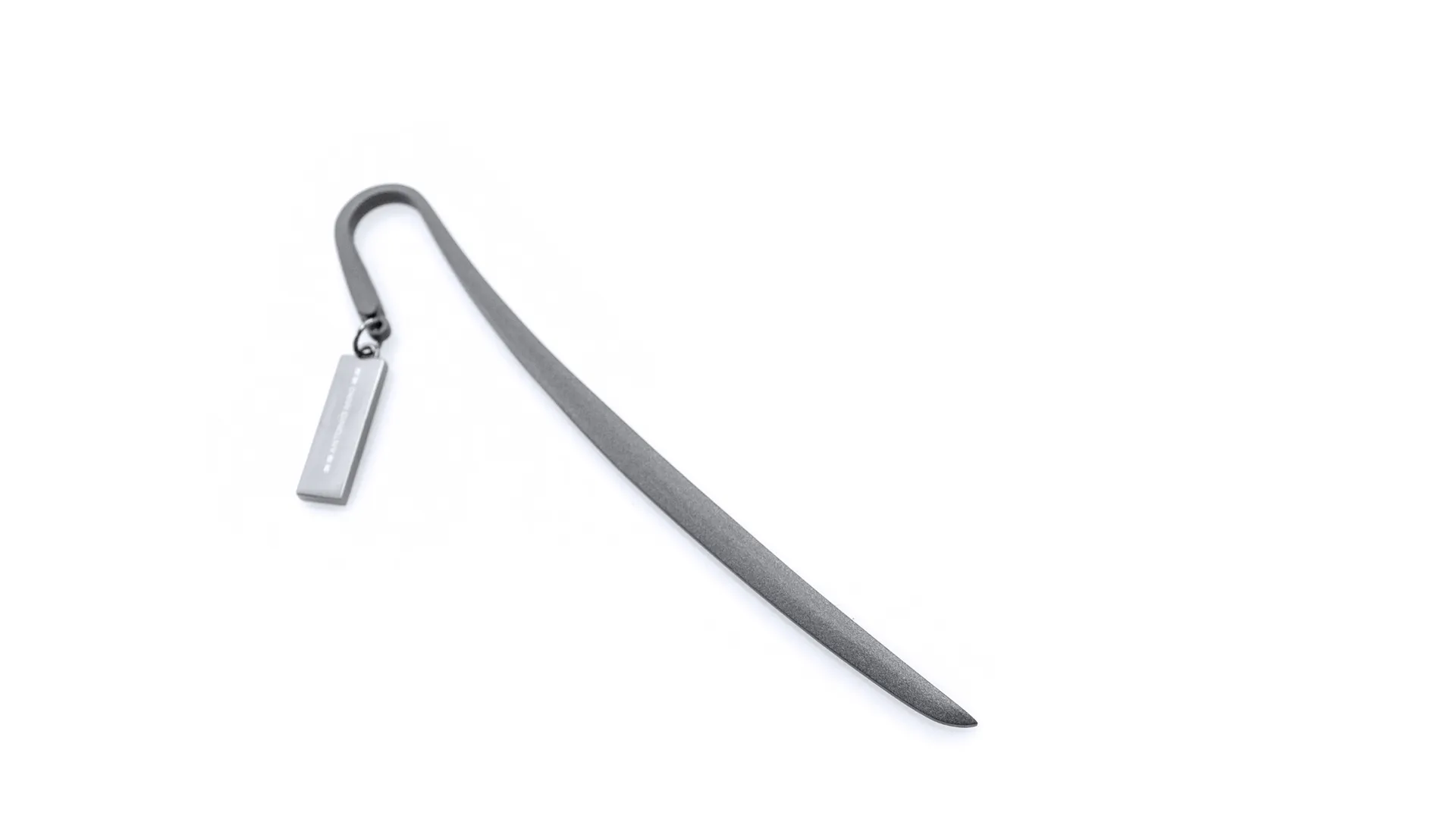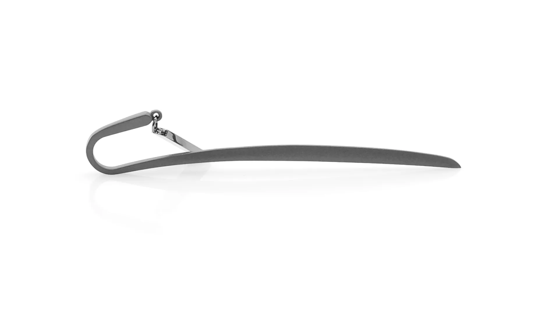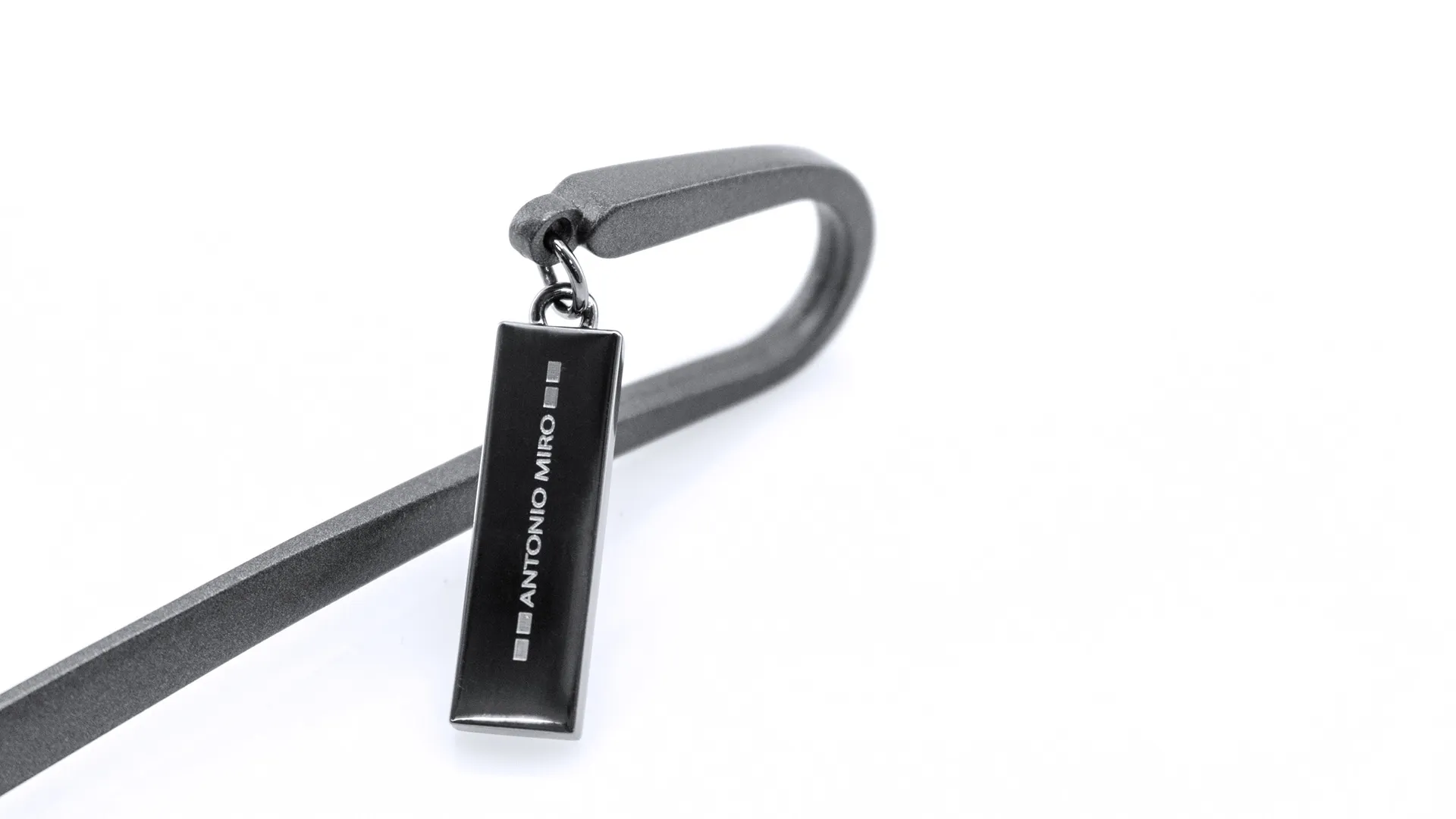 Marcapáginas metálico de Antonio Miró en elegante acabado gris oscuro. Con logotipo de la marca.