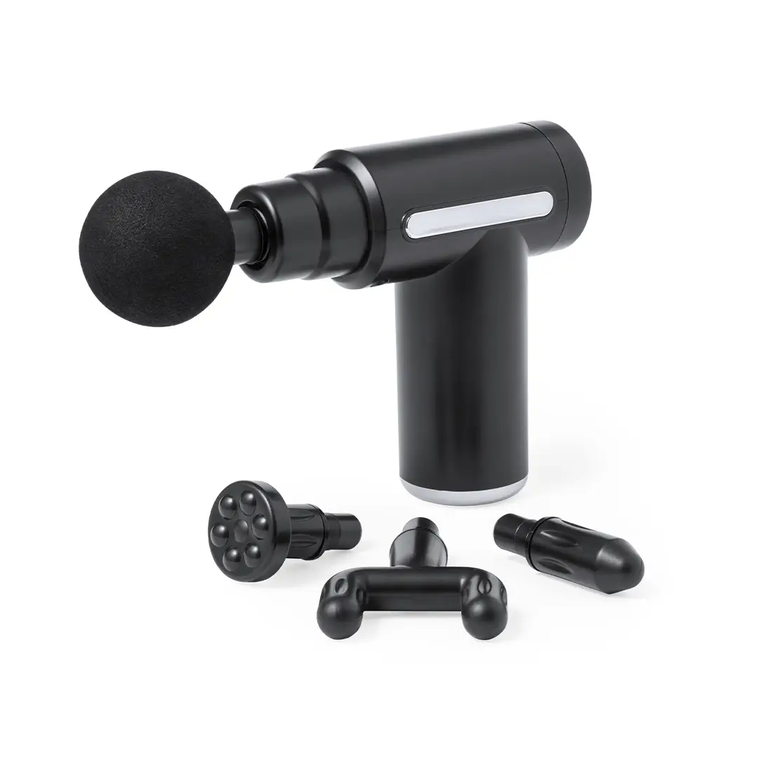 Masajeador eléctrico. Ayuda a relajar los músculos, aliviar los efectos del entrenamiento, liberar tensión y revitalizar el cuerpo. Con dos posiciones de intensidad y 4 cabezales para usar en distintas zonas del cuerpo. Batería recargable de larga duración de 1200 mAh – cable de carga USB incluido-. Disponible manual de instrucciones en español e inglés.