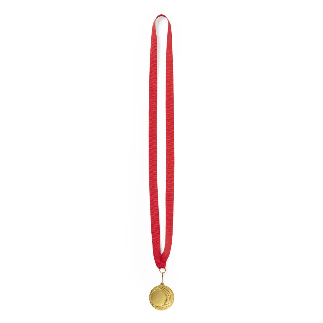 Medalla metálica de acabado dorado en relieve. Con cinta de poliéster en rojo, mosquetón metálico a juego y especialmente diseñada para marcaje en láser.
