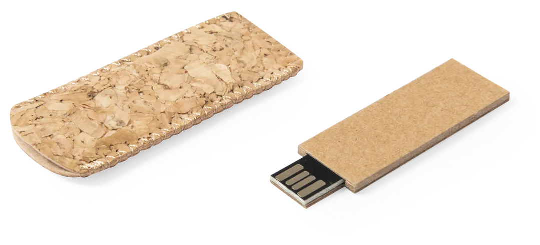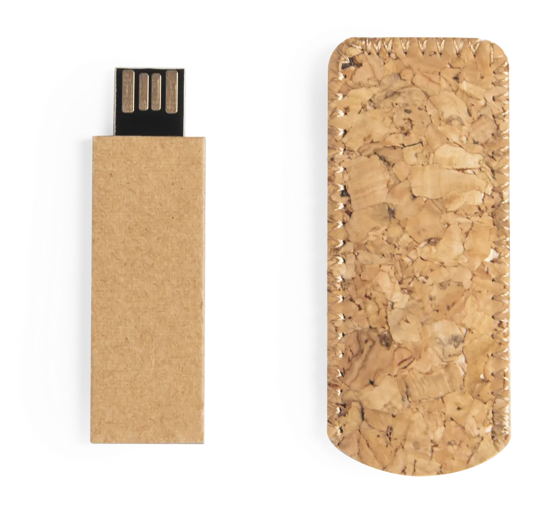 Memoria USB de 16GB de capacidad en línea nature. Cuerpo en cartón reciclado, presentada en una funda de corcho natural y en estuche individual de diseño eco.