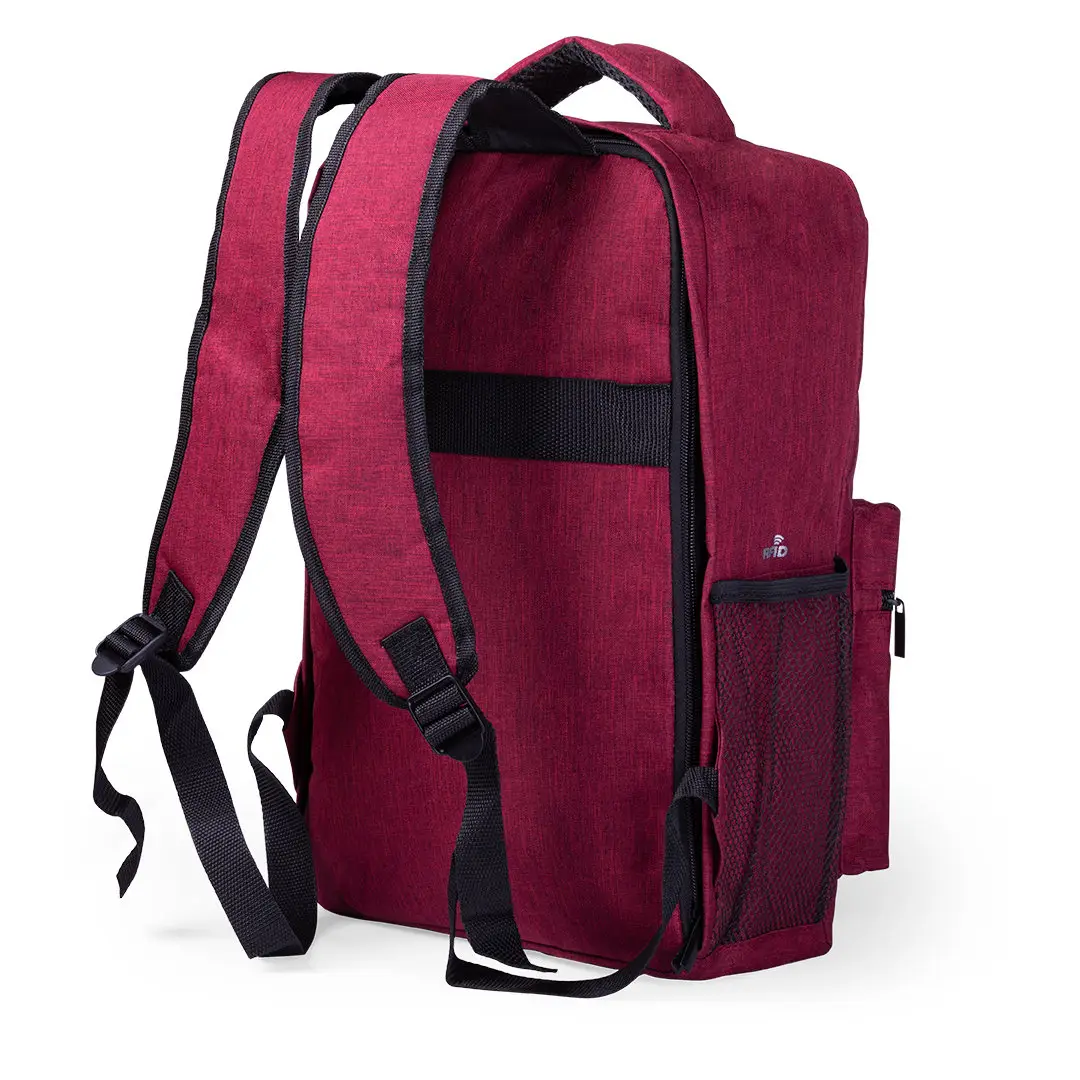 Mochila antirrobo en resistente material poliéster 300D. Con bolsillo antirrobo en la espalda para guardar objetos de valor. Compartimento interior con salida USB para conexión de powerbank -no incluido-. Incluye cable micro USB para total comodidad en la carga de cualquier dispositivo móvil. Bolsillo en lateral con protección RFID y compartimentos interiores acolchados para tablets de hasta 10 pulgadas y portátiles de hasta 15 pulgadas. Cinta para fijación al trolley y disponible en amplia gama de colores, con multitud de bolsillos interiores y exteriores. Cintas de hombros y espalda ajustables con acolchado.