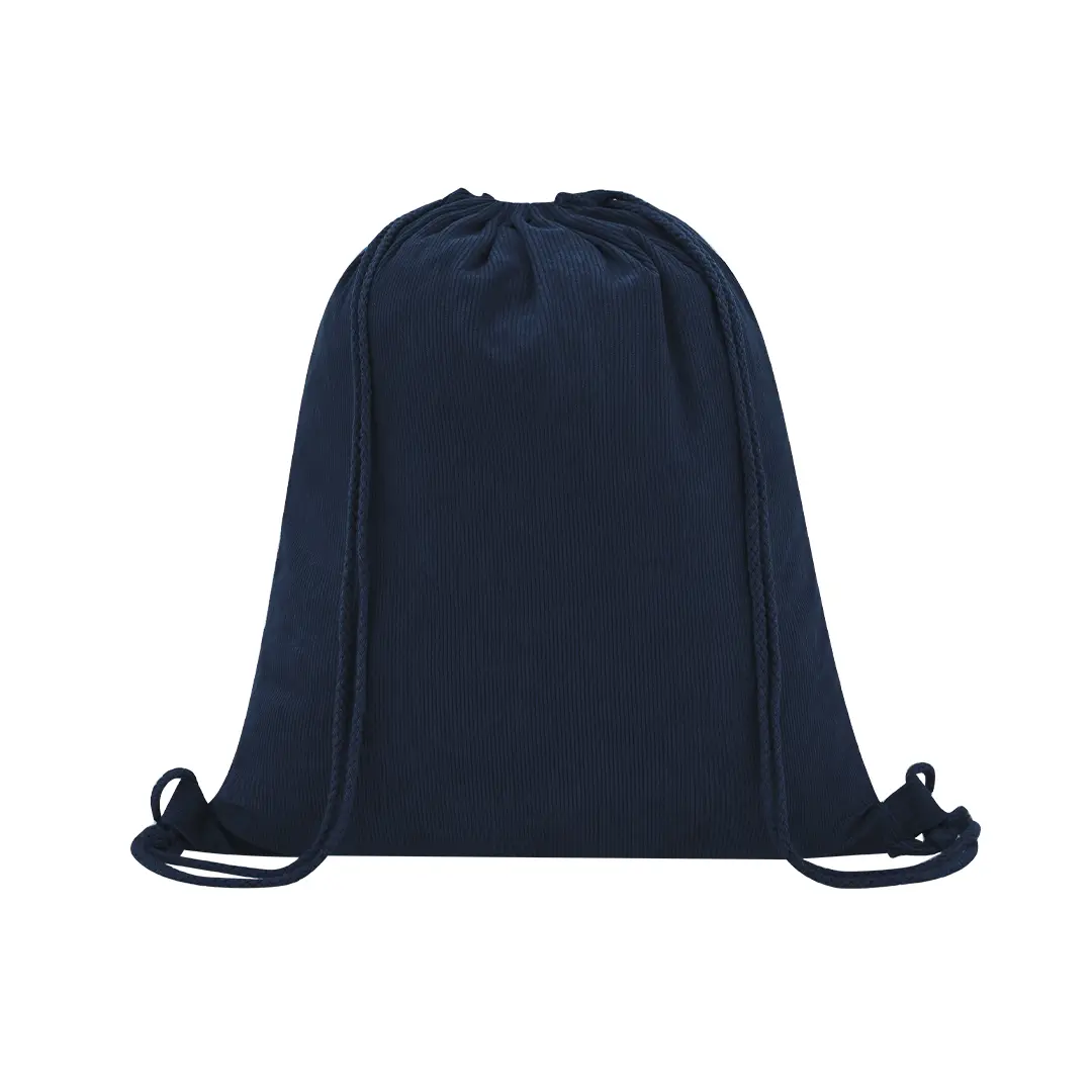 Mochila de cuerdas fabricada en resistente pana de poliéster. De acabado cosido, con cuerdas a juego y refuerzos laterales. Disponible en variada gama de colores.