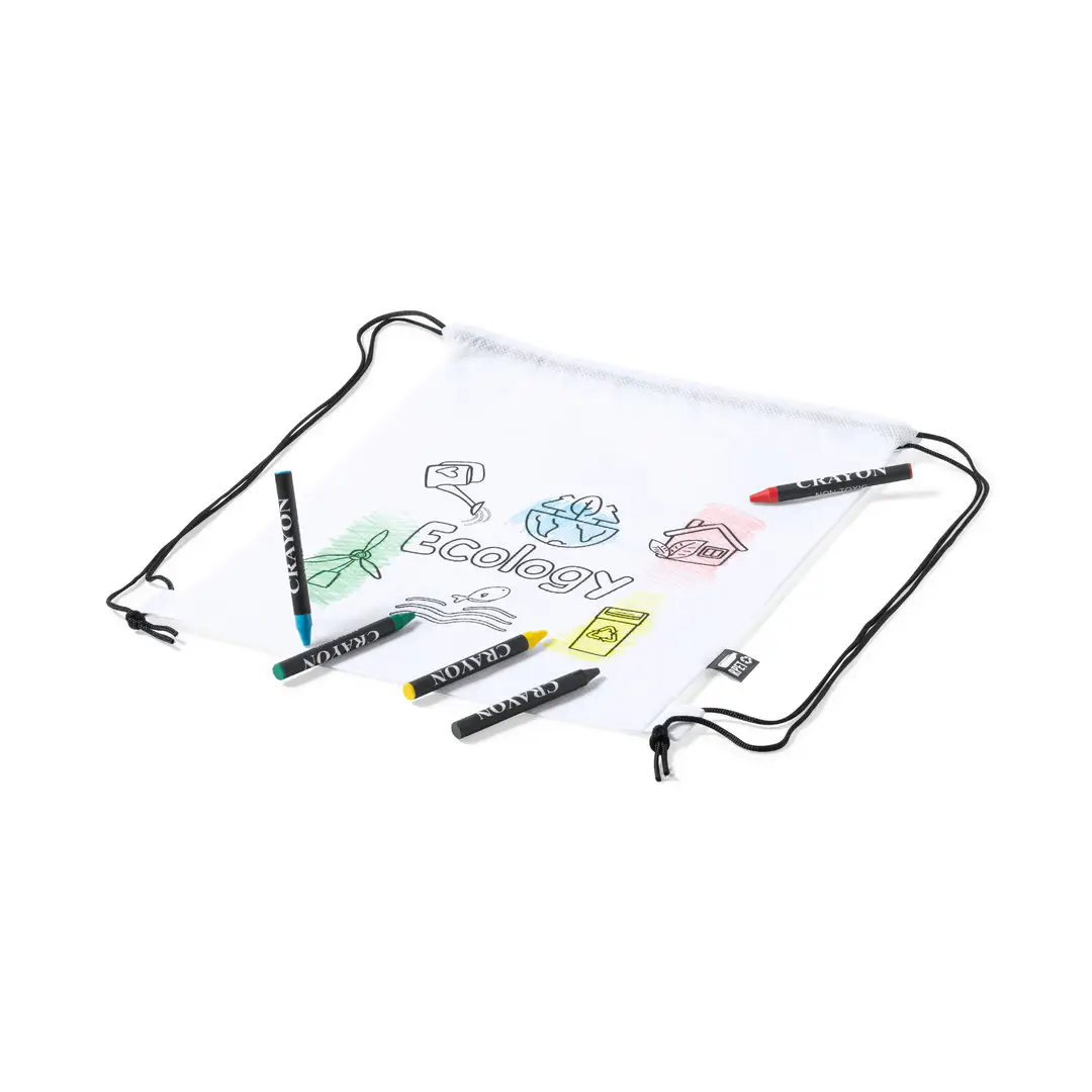 Mochila de cuerdas fabricada en non-woven RPET de color blanco, especialmente diseñada para colorear con ceras. Incluye 5 ceras en variados colores. Con cuerdas de cierre en color negro y refuerzo en las esquinas. Distintivo RPET en etiqueta exterior.El material RPET se elabora a partir de plástico reciclado, para así fomentar la reutilización de residuos plásticos y ayudar a la sostenibilidad del planeta.
