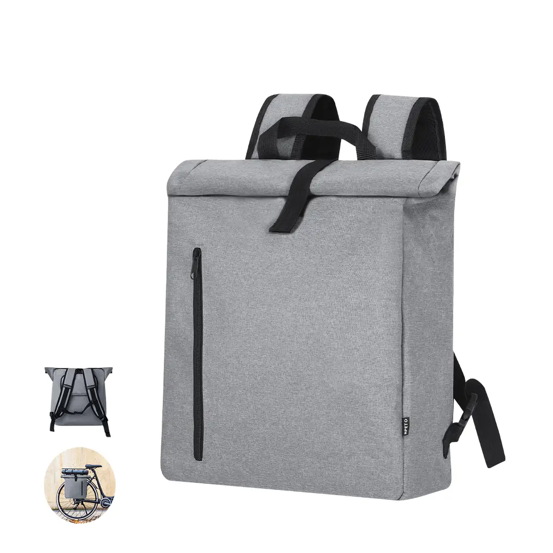 Mochila para bicicleta fabricada en resistente RPET 600D. Versátil y con cierre de hebilla, incluye un práctico bolsillo frontal con cremallera. En su parte trasera cuenta con enganches específicos universales para bicicleta, garantizando una mayor comodidad y seguridad en los desplazamientos. Además, dispone de un asas acolchadas y ajustables para los hombros, para así transportarla con mayor confort cuando se desacopla de la bicicleta. Etiqueta exterior con logotipo RPET.El material RPET se elabora a partir de plástico reciclado, para así fomentar la reutilización de residuos plásticos y ayudar a la sostenibilidad del planeta.
