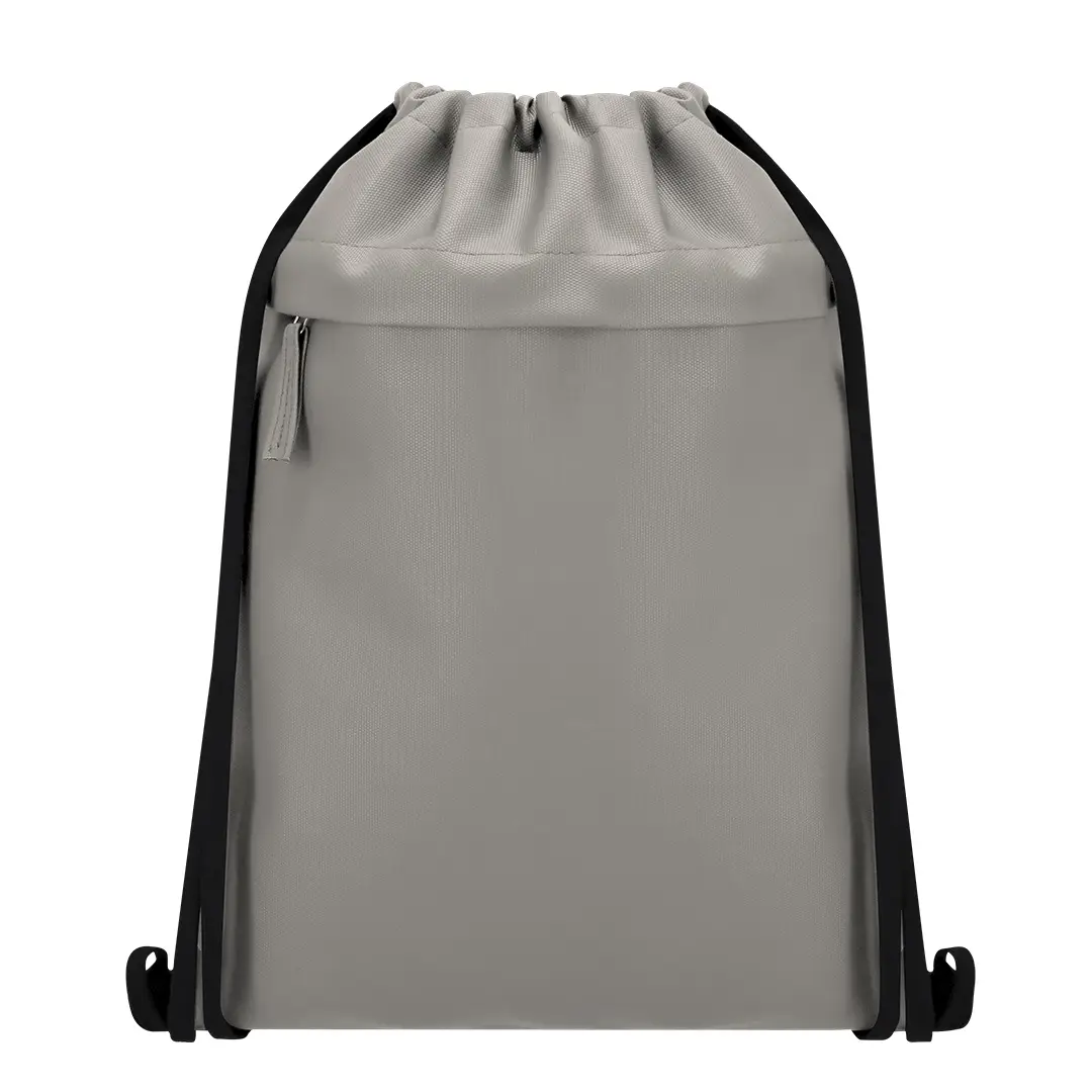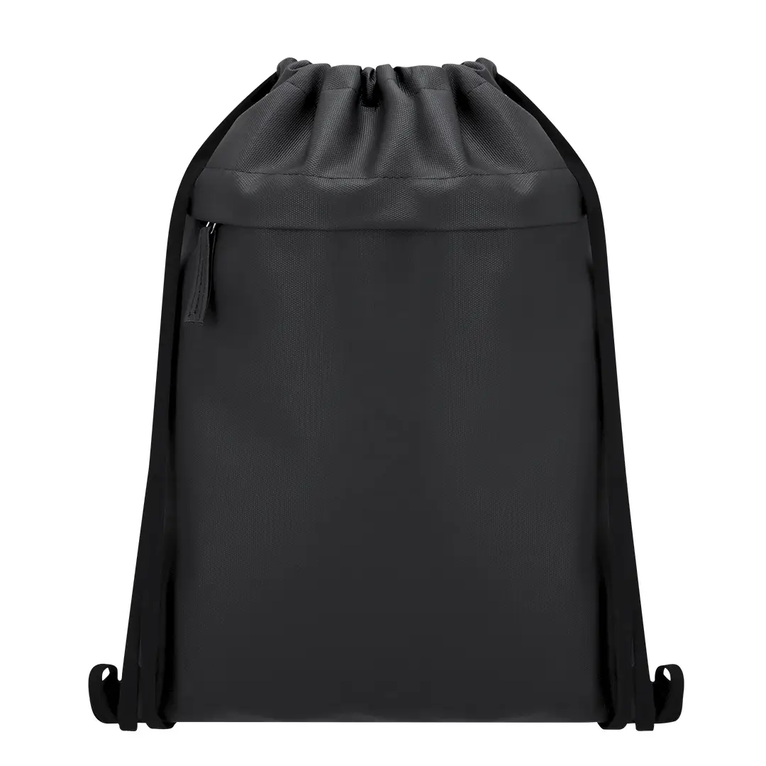 Mochila de cuerdas fabricada en suave PU combinado con resistente poliéster 600D. Incluye funcional bolsillo frontal con cierre de cremallera y tirador a juego en PU.