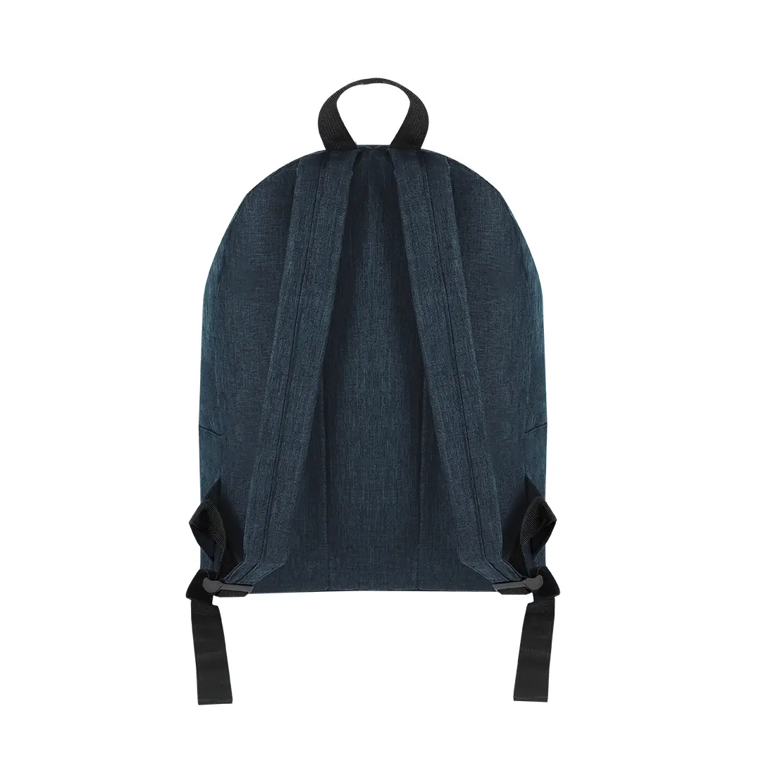 Mochila fabricada en suave Poliéster RPET 600D y diseño jaspeado. Con bolsillo principal de cierre de cremallera con doble tirador metálico negro con cordón para fácil agarre. Incluye bolsillo frontal con cierre de cremallera. Espalda y cintas acolchadas ajustables. Con distintivo de RPET en etiqueta.