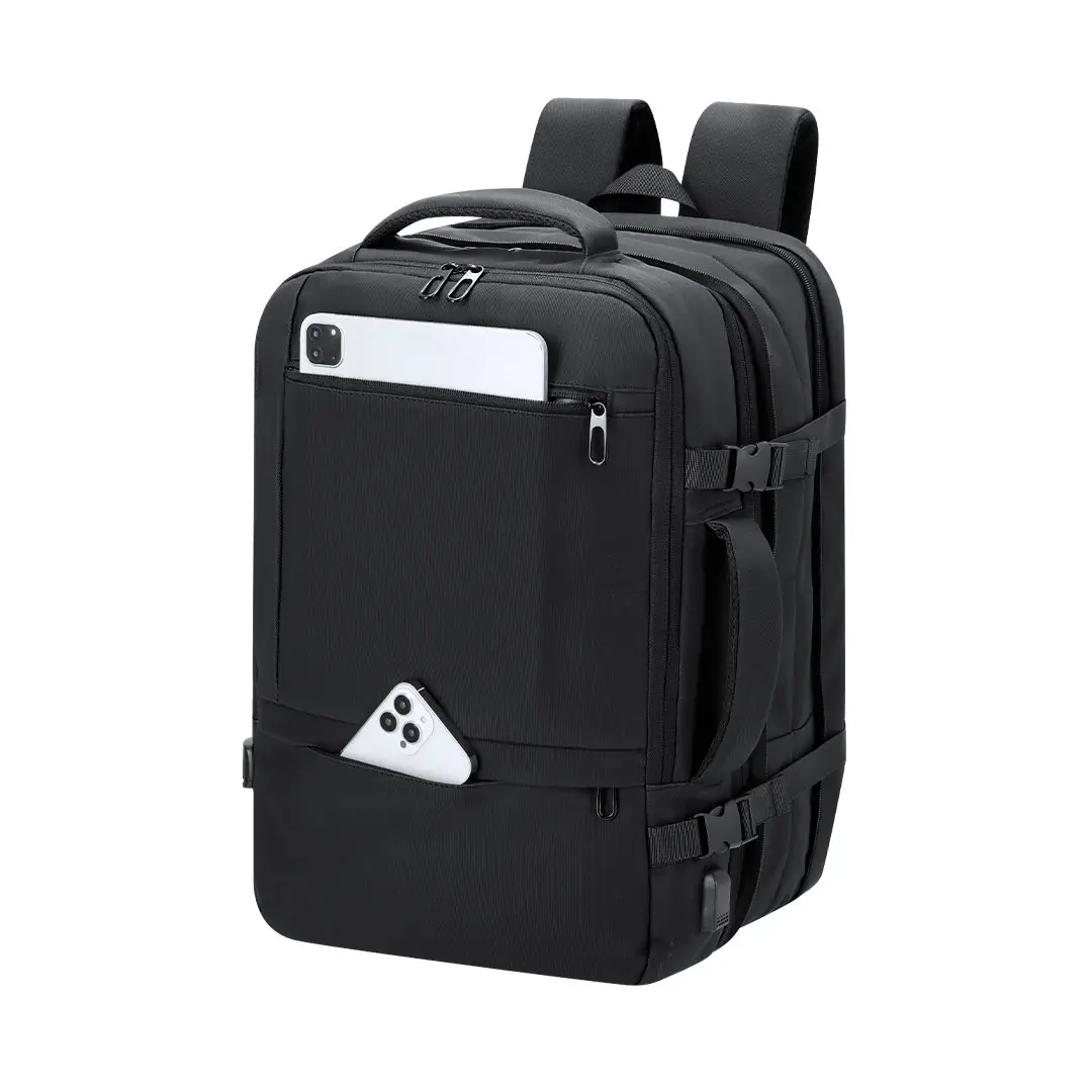Mochila multifunción extensible confeccionada en resistente PU.Cuenta con una excelente transpirabilidad en la zona trasera y en la cinta para los hombros, facilitando la disipación del calor gracias a sus cintas y respaldo acolchados. Las cintas anchas están diseñadas para aliviar la presión en los hombros, permitiendo llevar la mochila cómodamente durante largos periodos.Perfecta para cualquier situación por tener múltiples compartimentos:2 bolsillos frontales de diferentes tamaños.1 bolsillo trasero antirrobo para mayor seguridad.3 compartimentos grandes centrales con doble tirador, uno de ellos portatodo, un bolsillo central de gran capacidad para guardar ropa y/o complementos con organizador en su interior, y otro perfecto para llevar portátil de hasta 17 pulgadas.Incluye cinta para fijarla en trolley y maletas. Ajuste de cierre en el pecho.Bolsillo en cinta izquierda para hombros, ideal para guardar llaves u objetos de pequeño tamaño. Además, cuenta con un puerto de carga USB y con correa pectoral con hebilla para un ajuste seguro. Perfecta para viajes o para el día a día por sus cintas ajustables, adaptándose a todo estilo de vida.
