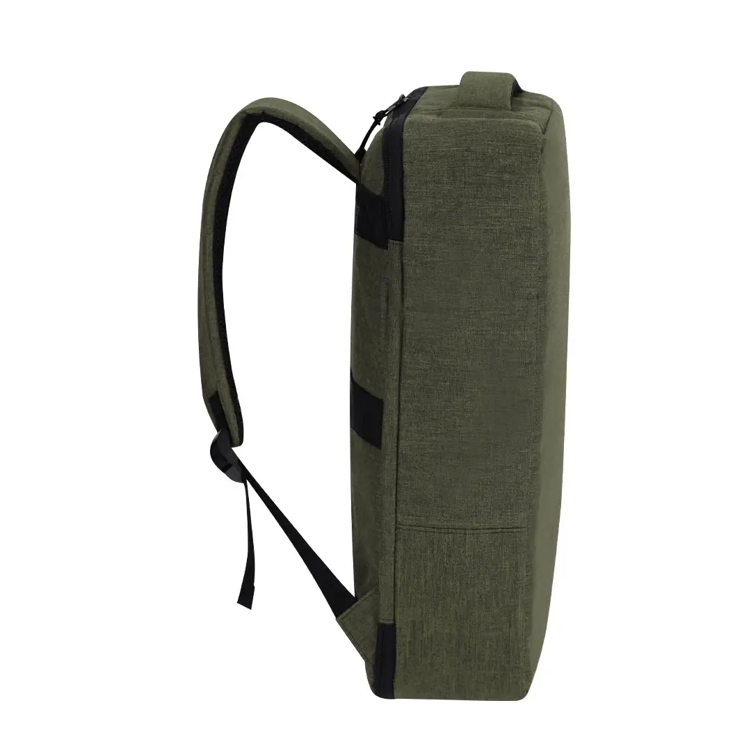 Mochila portadocumentos confeccionada en resistente RPET 300D. Presenta un diseño urbano que incorpora un bolsillo principal con cierre de cremallera oculta para mayor protección, de doble tirador. Con interior acolchado para portátil de hasta 15 pulgadas, bolsillos adicionales en el interior para pequeños objetos. Sus cintas de hombros y la espalda están acolchadas y son ajustables para mayor comodidad. Ofrece tres modalidades de transporte: como mochila, gracias a las tiras de hombros colchadas; como portadocumentos, gracias a su asa de transporte; y cinta para trolley. El material RPET se elabora a partir de plástico reciclado, para así fomentar la reutilización de residuos plásticos y ayudar a la sostenibilidad del planeta.