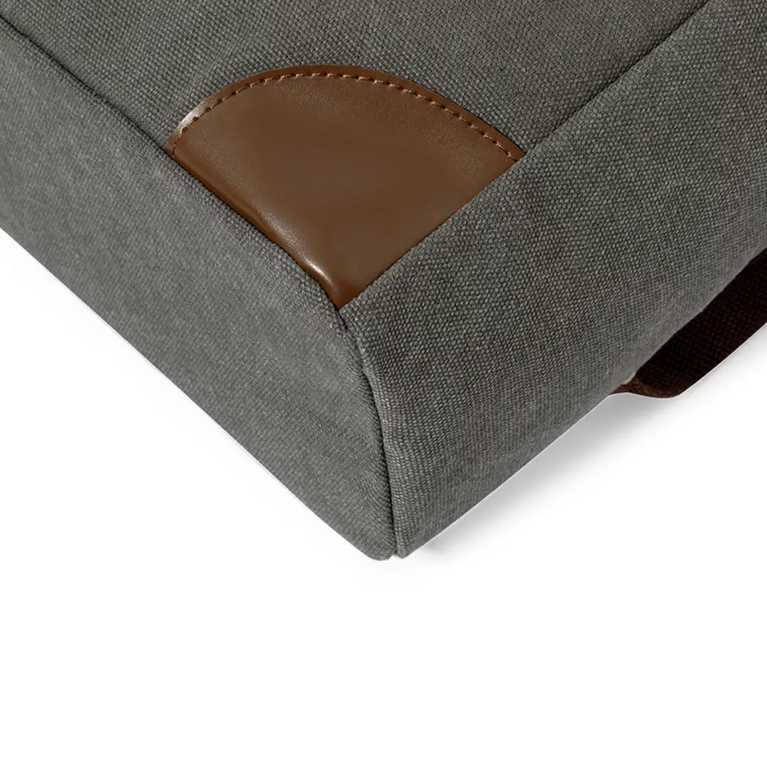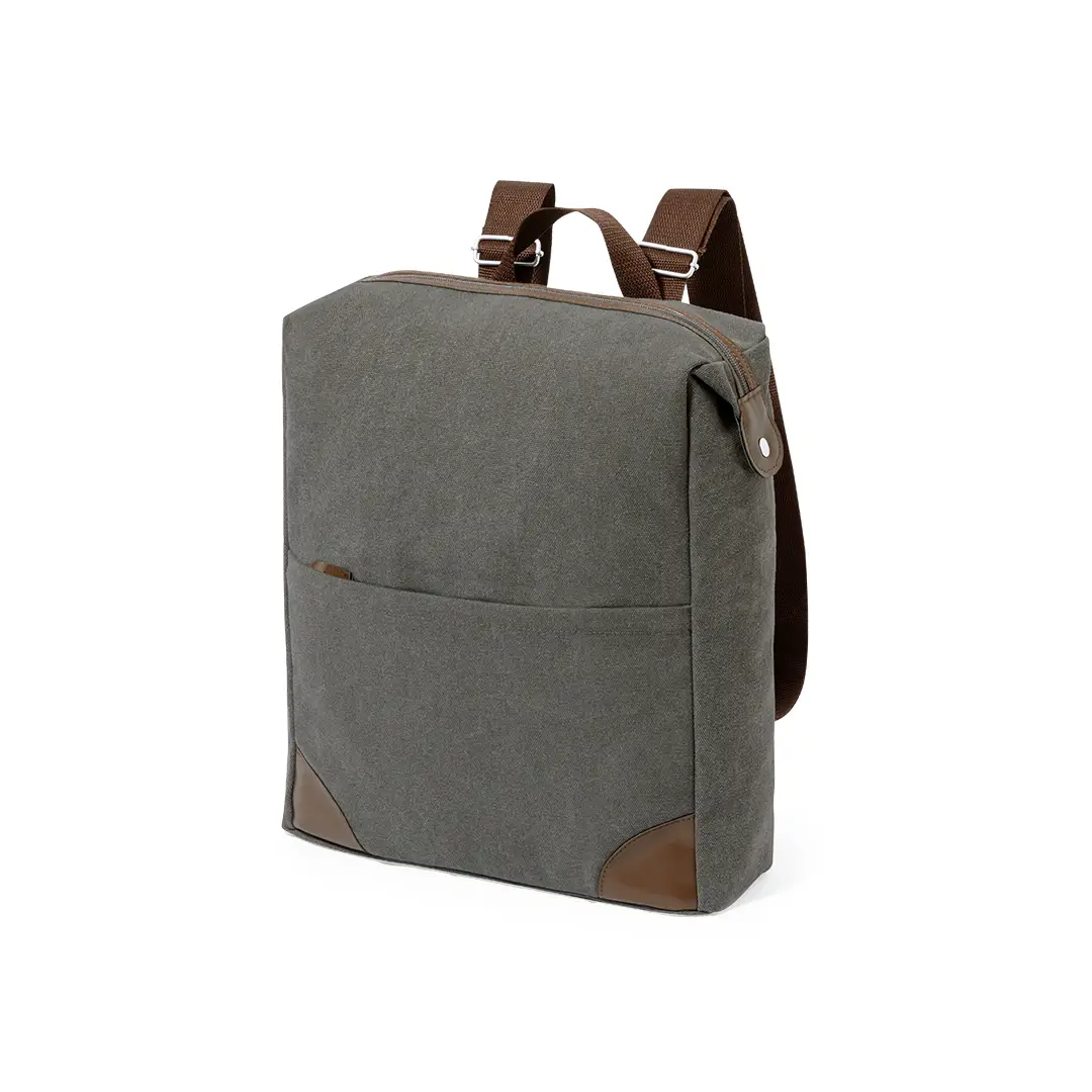 Mochila de diseño atemporal, fabricada en resistente canvas de 475g/m2 de color gris, con cremalleras y asa de transporte en polipiel. Interior acolchado con compartimentos independientes para tablet de hasta 10 pulgadas y ordenador portátil de hasta 15 pulgadas. Con práctico bolsillo frontal en el exterior, espalda acolchada y cintas para hombros ajustables y acolchadas en resistente poliéster. Con esquinas reforzadas para una mayor resistencia.Presentado en bolsa individual reciclada.