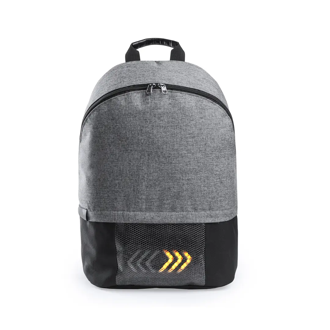 Mochila con indicadores, en resistente poliéster 600D. Indicadores luminosos en la base, con señalización controlada desde las cintas de hombros de la mochila. Bolsillo principal con doble tirador e interior con bolsillo acolchado para ordenador portátil de hasta 15 pulgadas. Espalda y cintas acolchadas. Conexión micro USB -cable incluido-. Requiere de un powerbank -no incluido- para el funcionamiento de las luces.