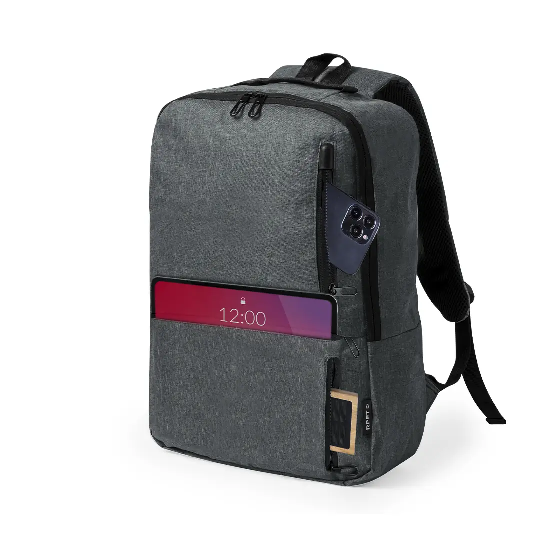 Mochila elaborada en resistente 600D RPET. Equipada con un cierre de cremallera de doble tirador y tres bolsillos frontales de acceso rápido. En su interior, cuenta con compartimentos acolchados diseñados para tablet de hasta 10 pulgadas y portátil de hasta 15 pulgadas. Las cintas de hombros son acolchadas y ajustables para brindar comodidad. Además, presenta una cinta superior y bolsillo lateral para mayor funcionalidad. Disponible en tres elegantes colores, con cremalleras negras. Logotipo RPET en etiqueta. Presentada en una bolsa individual reciclada. El material RPET se elabora a partir de plástico reciclado, para así fomentar la reutilización de residuos plásticos y ayudar a la sostenibilidad del planeta.