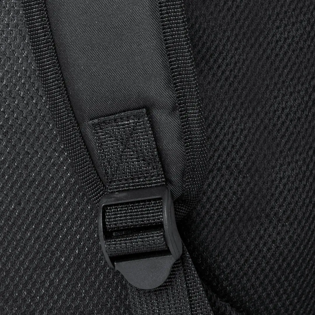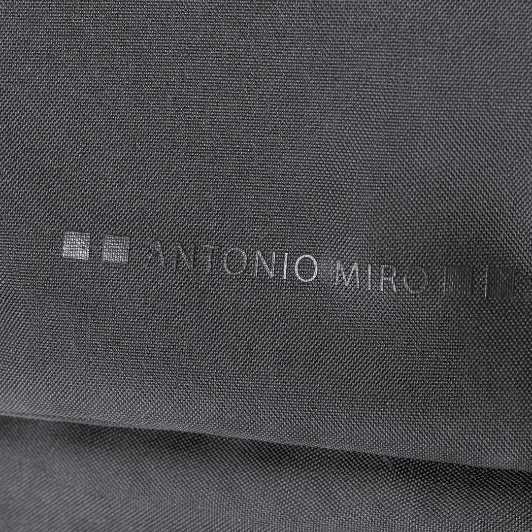 Mochila de Antonio Miró, fabricada en resistente poliéster 300D con acabados en negro. Compartimento principal y bolsillos exteriores con cierre de cremallera a juego asa de transporte y bolsillos laterales. Cintas de ajuste laterales con cierre de hebilla y logotipo de la marca en la base. Compartimentos interiores acolchados para ordenador portátil de hasta 17 pulgadas y tablet de hasta 10 pulgadas. Parte trasera acolchada y cintas para hombros ajustables y acolchadas con accesorio de ajuste en la parte trasera para barra de trolley.