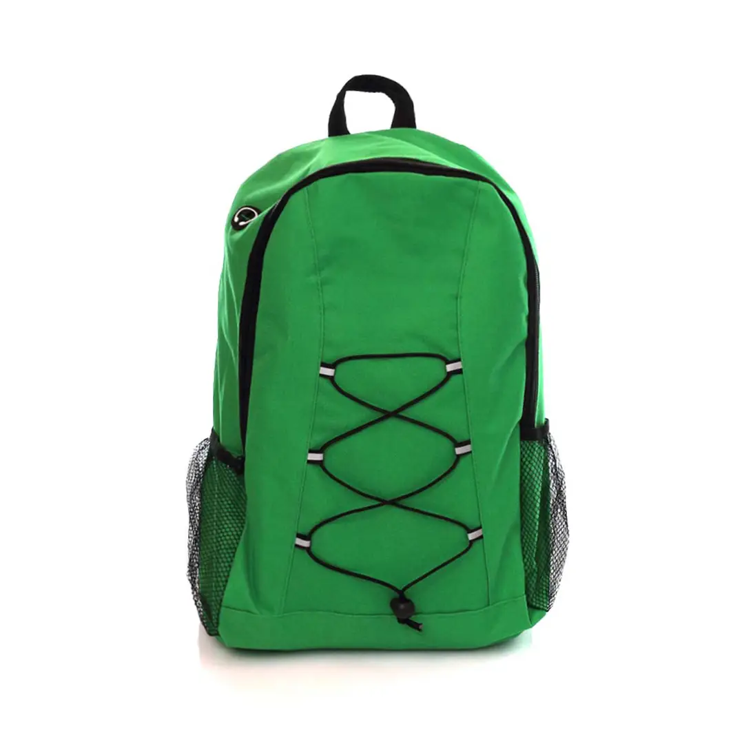 Mochila fabricada en resistente poliéster 600D. Práctico bolsillo central con cierre de cremallera y salida de auriculares, con útiles bolsillos laterales y cuerda elástica en el frontal a juego con la cremallera. Cómodas cintas ajustables a los hombros acolchadas como la espalda. Disponible en variados y desenfadados colores.