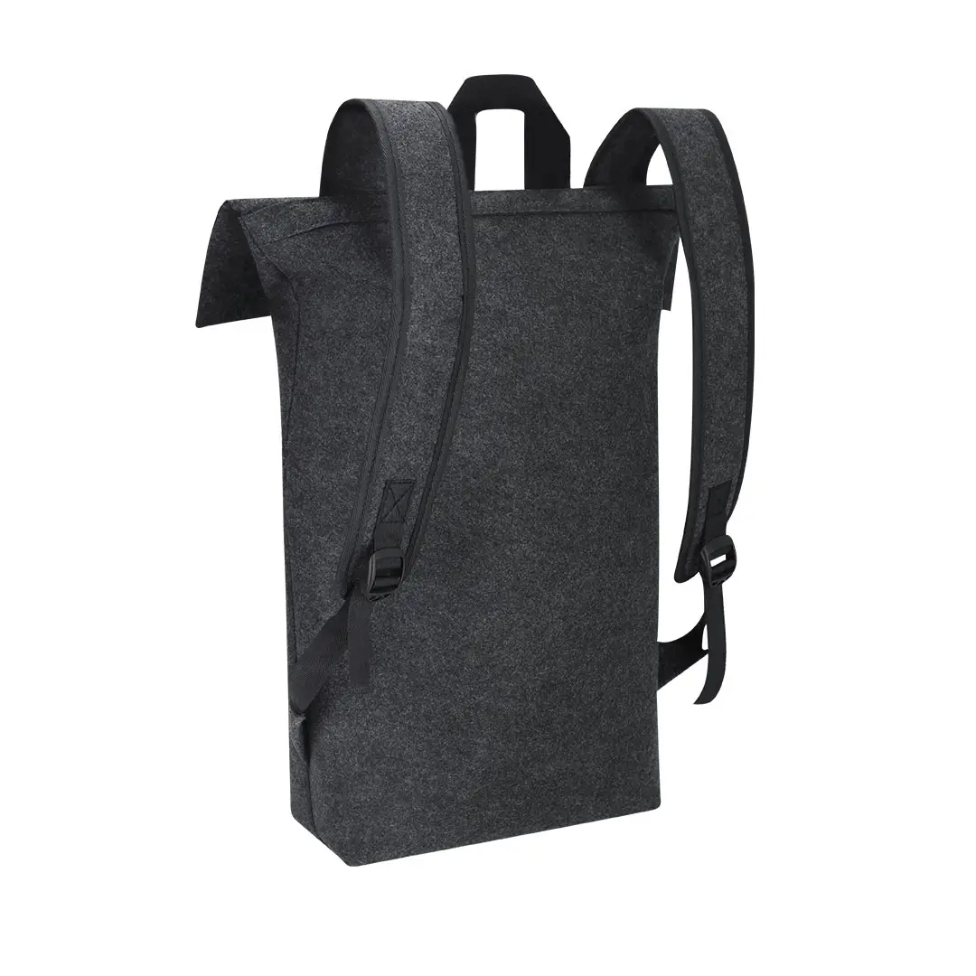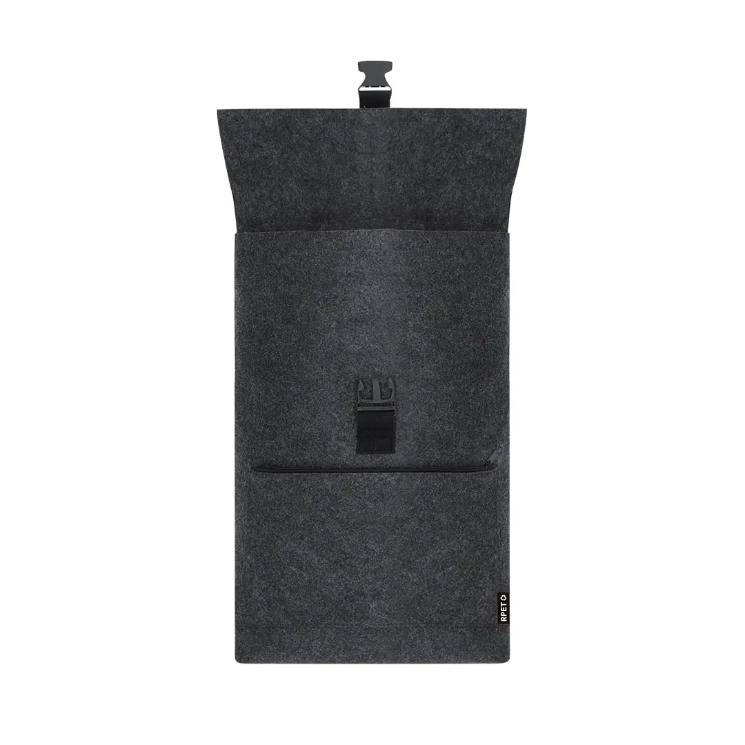 Mochila de fieltro RPET. Cuenta con bolsillo principal con cierre de hebilla y bolsillo frontal adicional con cierre de cremallera. Equipada con cintas para los hombros ajustables y reforzadas y asa superior. Incluye distintivo RPET en etiqueta exterior.El fieltro RPET es fruto de la combinación del proceso de reciclaje de materiales plásticos junto con la técnica milenaria de fabricación del fieltro, dando como resultado un material de eco-tendencia que, además de ser de origen reciclado, también se convierte en reciclable.