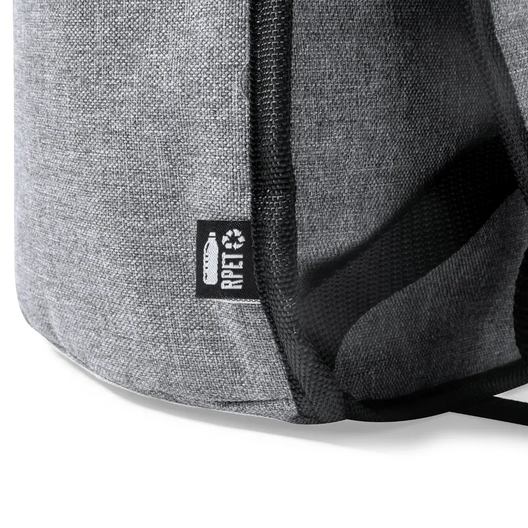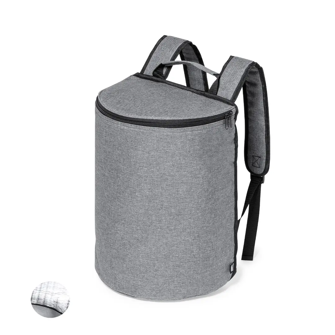 Mochila nevera fabricada en resistente 600D RPET. Acabado en color gris, con asa de transporte. Cintas para hombros acolchadas y ajustables. Compartimento principal con cierre de cremallera y tiradores metálicos. Interior isotermo en aluminio y etiqueta exterior con distintivo RPET.El material RPET se elabora a partir de plástico reciclado, para así fomentar la reutilización de residuos plásticos y ayudar a la sostenibilidad del planeta.