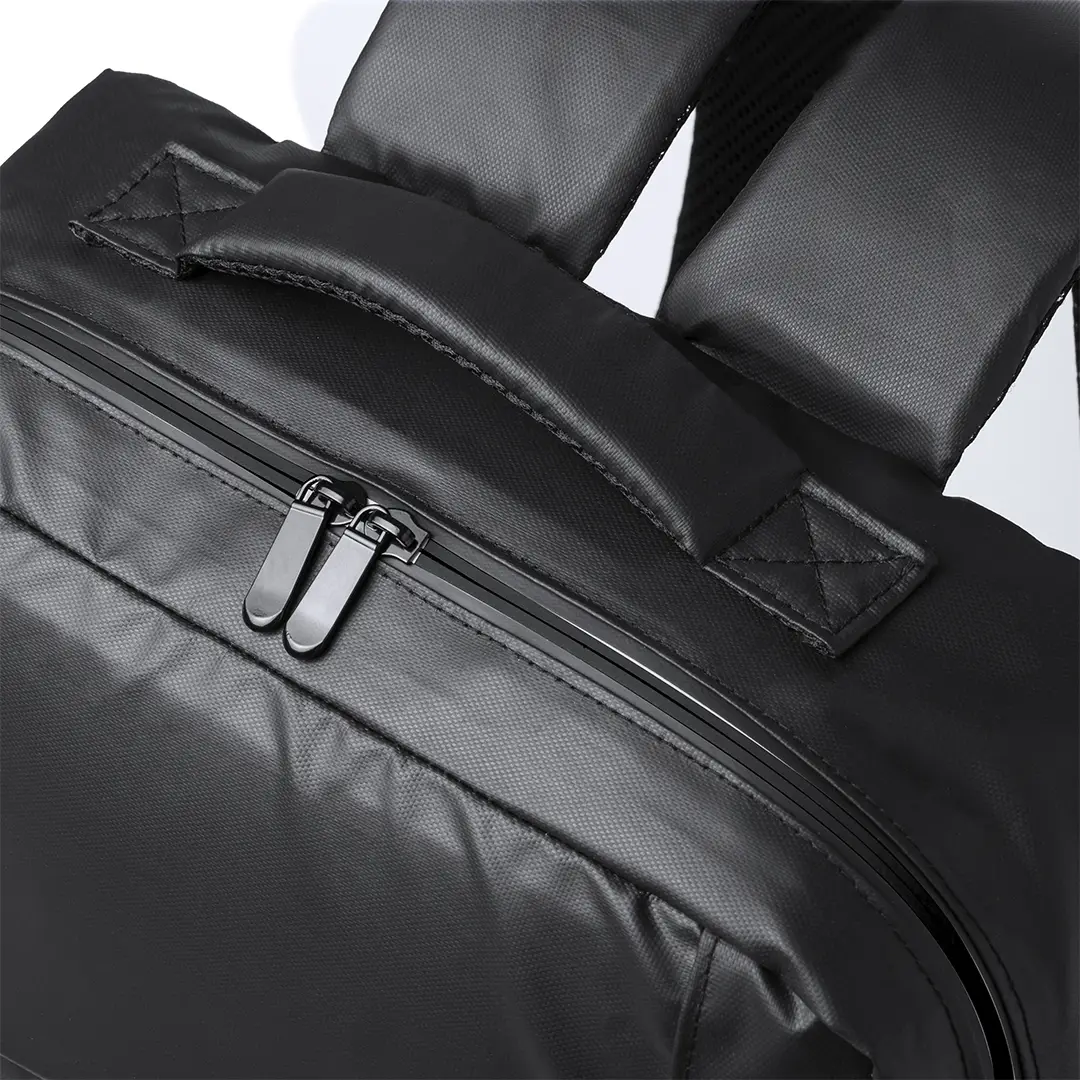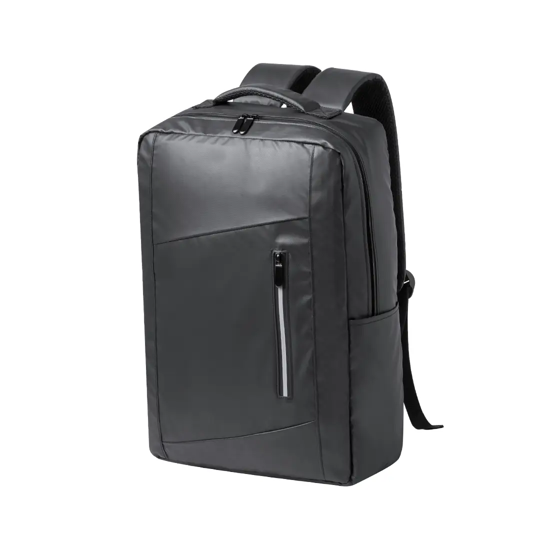 Mochila confeccionada en elegante polipiel. Caracterizada por un diseño urbano que incorpora un bolsillo acolchado para tablet de hasta 10 pulgadas y portátil de hasta 15 pulgadas. Además, cuenta con un bolsillo frontal destacado por una banda reflectante. Espalda y cintas de hombros acolchadas, ajustables y fabricadas con tela transpirable en la parte interior. Incluye un accesorio de ajuste para trolley y una cómoda asa superior acolchada. Presentado en una bolsa individual reciclada.