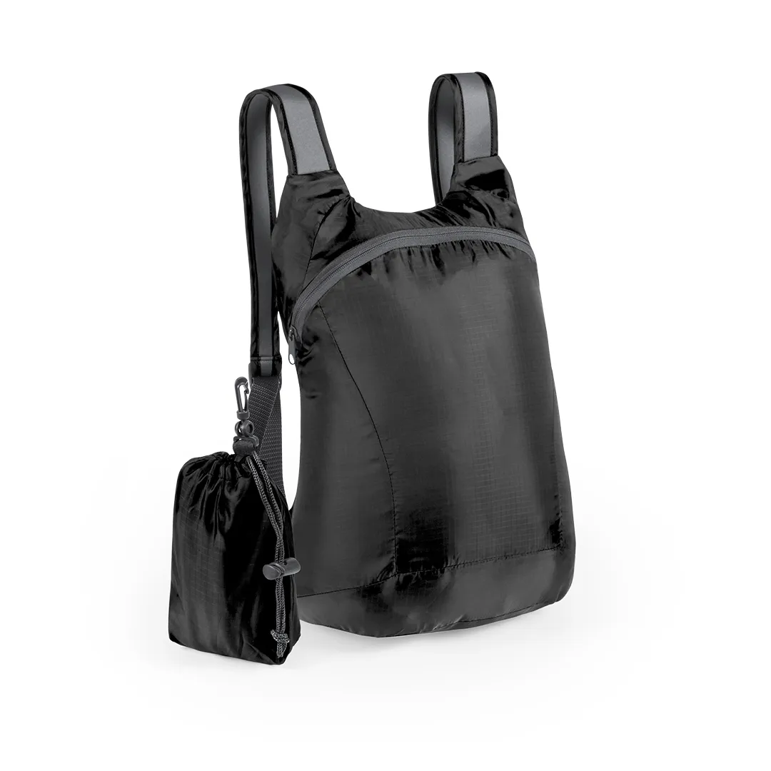 Mochila plegable en suave y resistente material ripstop. Cierre de cremallera, accesorios en color gris y cintas de hombros regulables. Plegado de tamaño compacto, con cinta y mosquetón de transporte. Disponible en variada gama de colores.