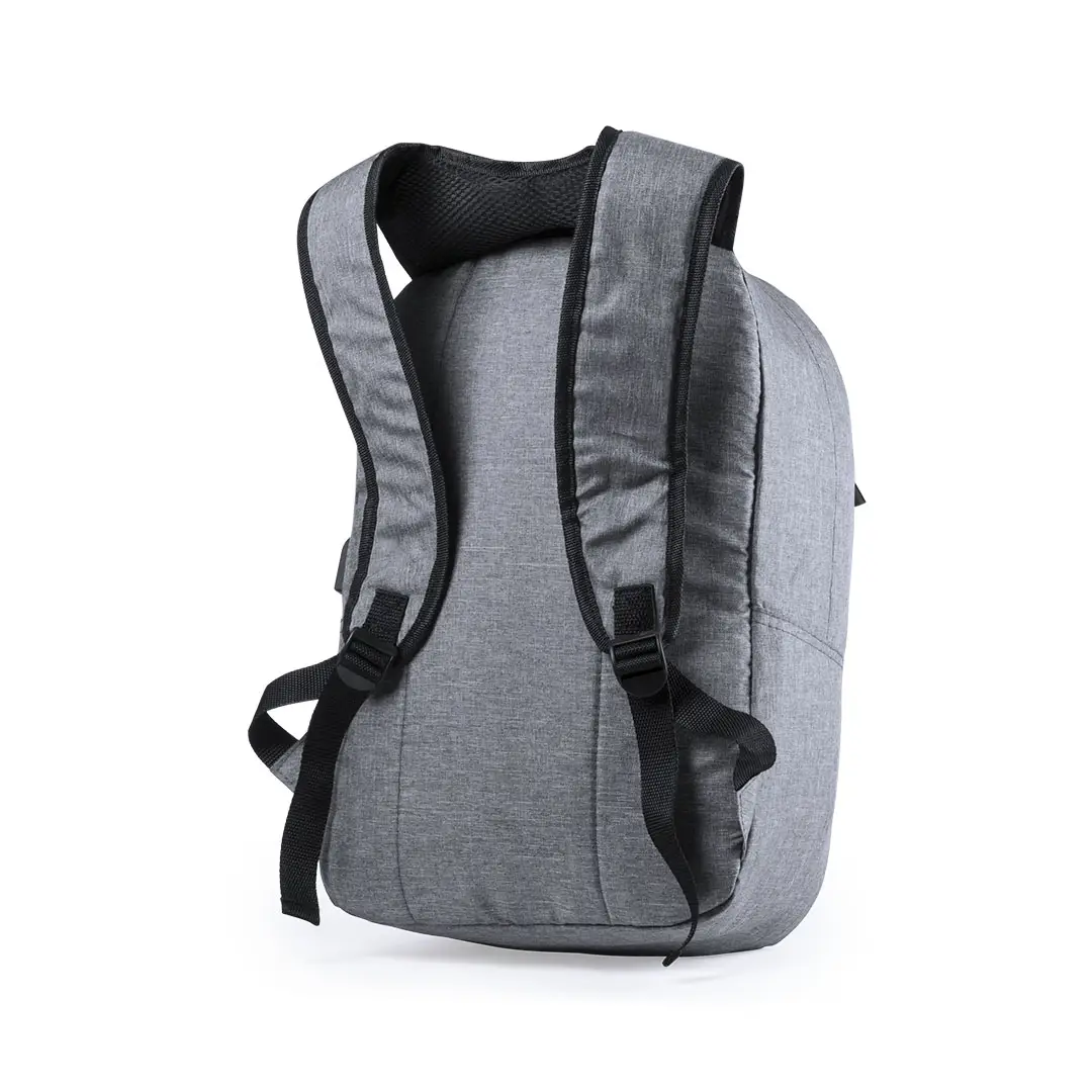 Mochila de seguridad, con diseño urbano en resistente poliéster 300D. Bolsillo interior con protección de seguridad RFID (Identificación por Radio Frecuencia) que mantiene seguros los datos de la tarjeta y demás dispositivos. Compartimento principal con elegante tapeta en la cremallera. Con conexión USB -powerbank no incluido- y bolsillo interior acolchado para ordenador portátil de hasta 15 pulgadas. Parte trasera y cintas acolchadas.