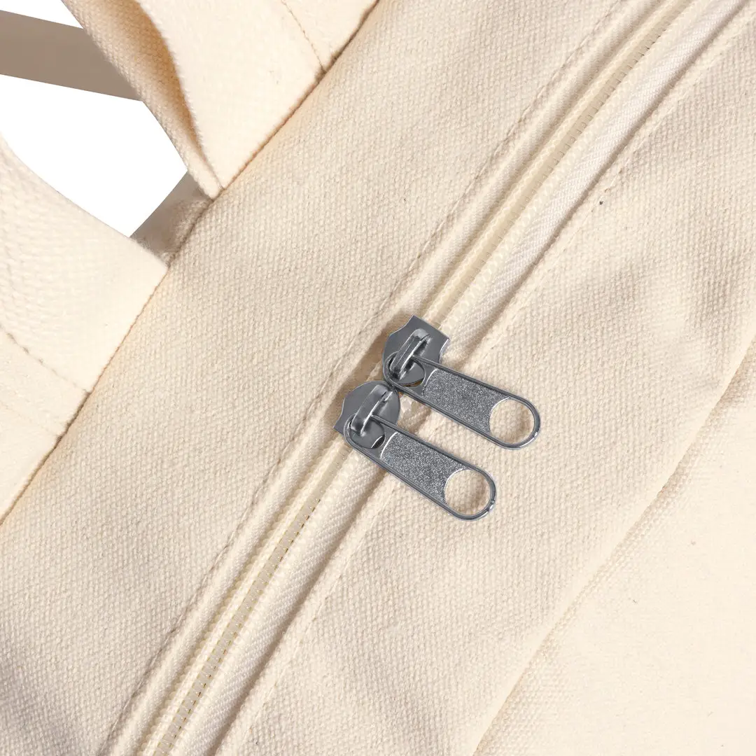 Mochila de línea nature fabricada en 100% algodón orgánico de acabado natural. Compartimento principal con cierre de cremallera a juego y doble tirador. Bolsillo exterior con cierre de cremallera, con espalda y cintas para hombros acolchadas. Etiqueta exterior con distintivo algodón orgánico y tarjeta explicativa en cartón kraft.
