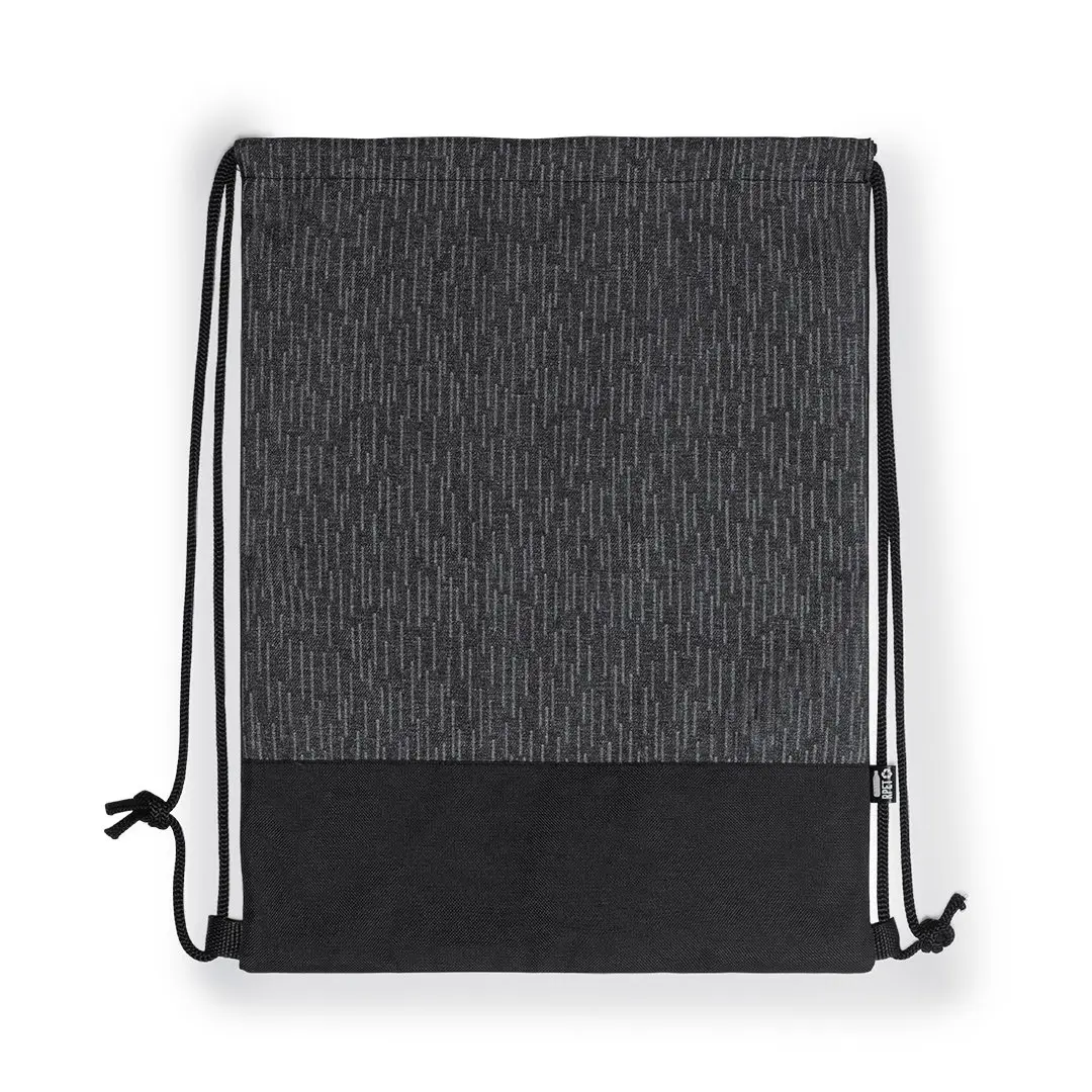 Mochila de cuerdas reflectante de línea nature en resistente poliéster 600D RPET, elaborado a partir de plástico reciclado, para así fomentar la reutilización de residuos plásticos y ayudar a la sostenibilidad del planeta. En elegante combinación de colores negro y gris, con cuerdas autocierre en negro. Etiqueta distintiva RPET. Fabricada empleando filamentos con gran capacidad para reflejar intensamente la luz, gracias a millones de pigmentos reflectantes y basándose en el principio de la retro-reflexión de la luz, una propiedad de visibilidad nocturna que consiste en la refracción de la luz hacia la fuente de origen de la misma.