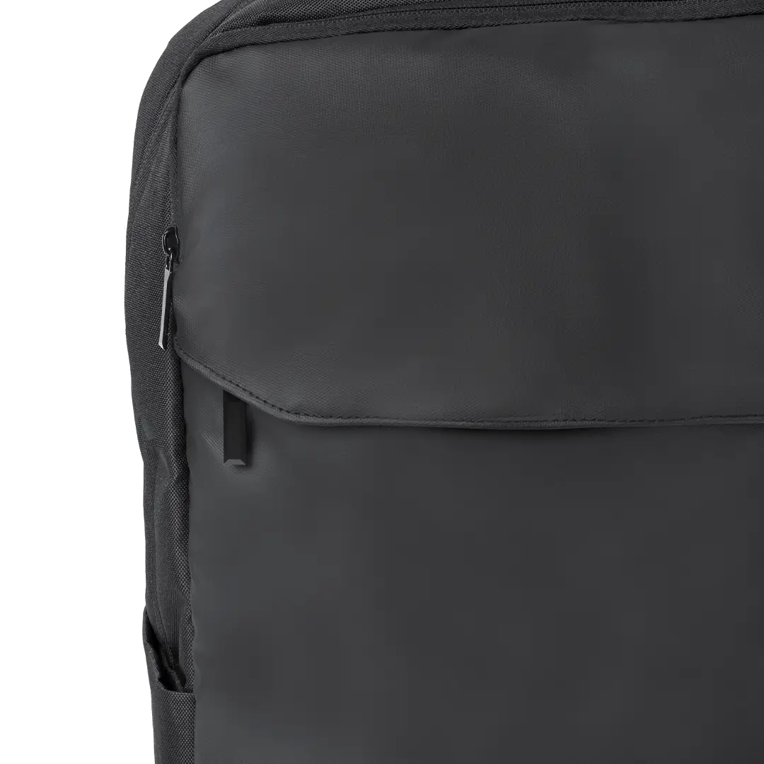 Mochila confeccionada en elegante polipiel. De diseño urbano que incluye un bolsillo central acolchado con doble cierre para tablet de hasta 10 pulgadas y portátil de hasta 15 pulgadas, así como un bolsillo segundario. Además, tiene un bolsillo frontal con cremallera y solapa protectora. Las cintas de hombros y la espalda son acolchadas, ajustables y cuentan con una tela transpirable. Incorpora un accesorio para ajustarse al trolley y una cómoda asa en la parte superior. Presentada en una bolsa individual reciclada.