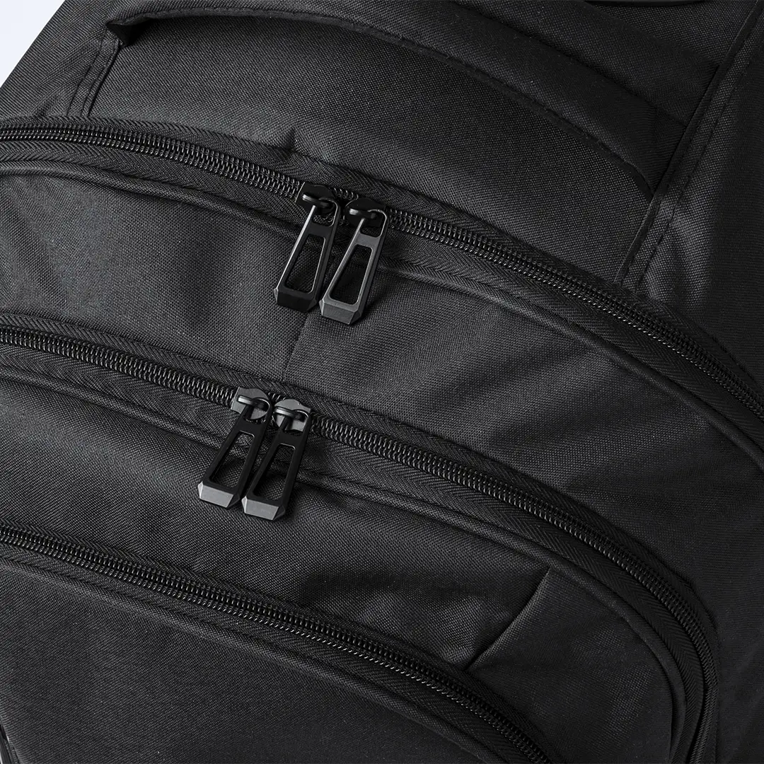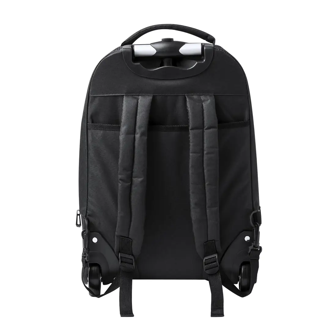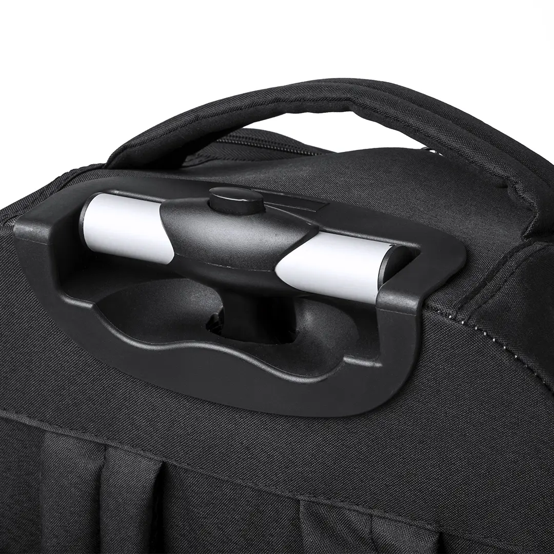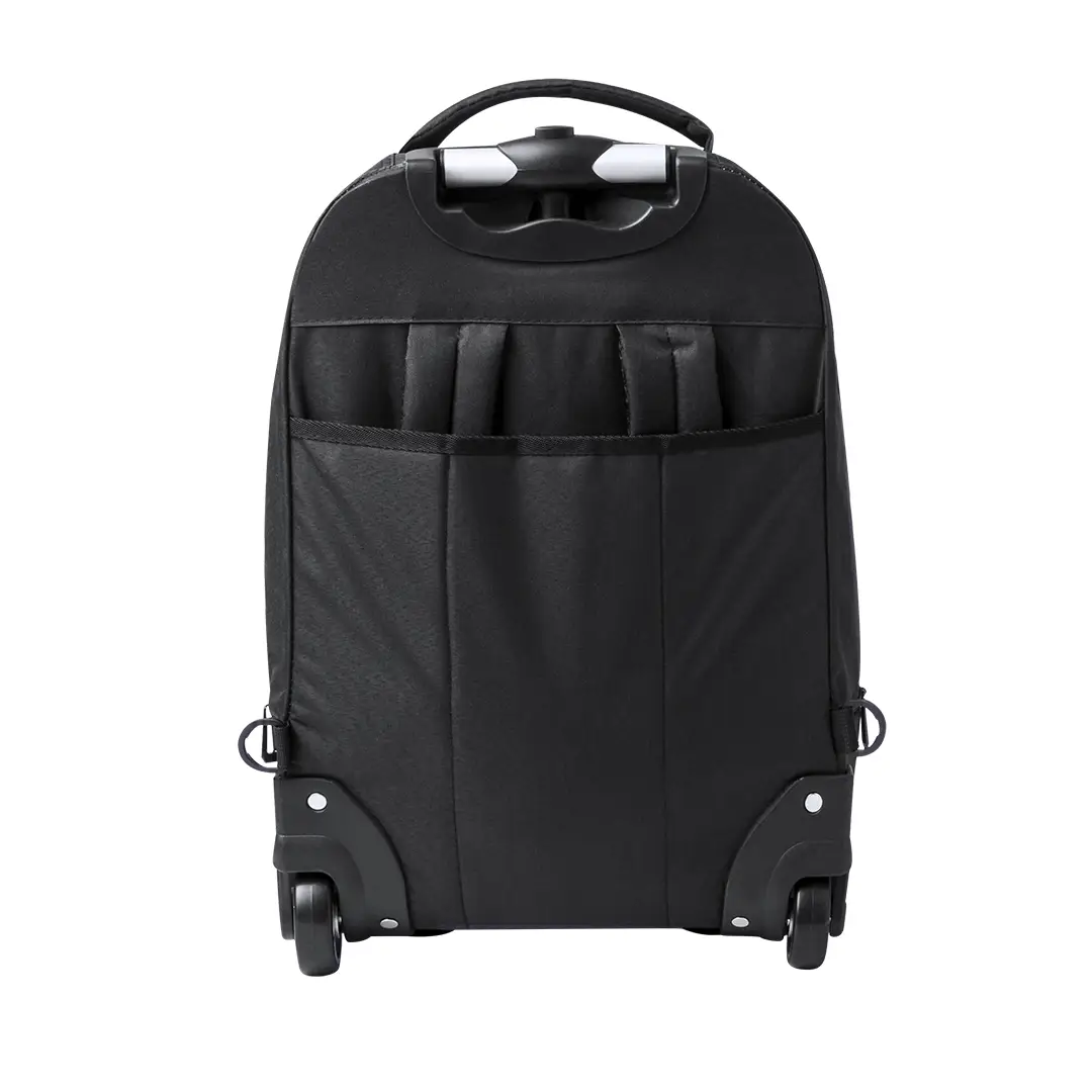 Mochila trolley de 2 ruedas en poliéster 300D de alta calidad. Incluye compartimento interior acolchado para ordenador portátil de hasta 15 pulgadas. Con asa exterior reforzada a juego y prácticos bolsillos en parte frontal. Con cremalleras a juego, además incluye cintas para hombro acolchadas y ocultas en parte posterior para usar como mochila. Presentado en bolsa individual reciclada.