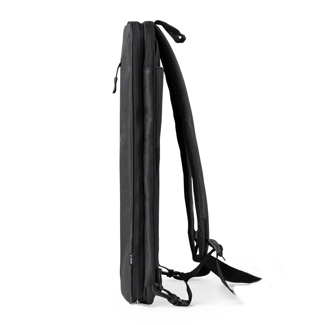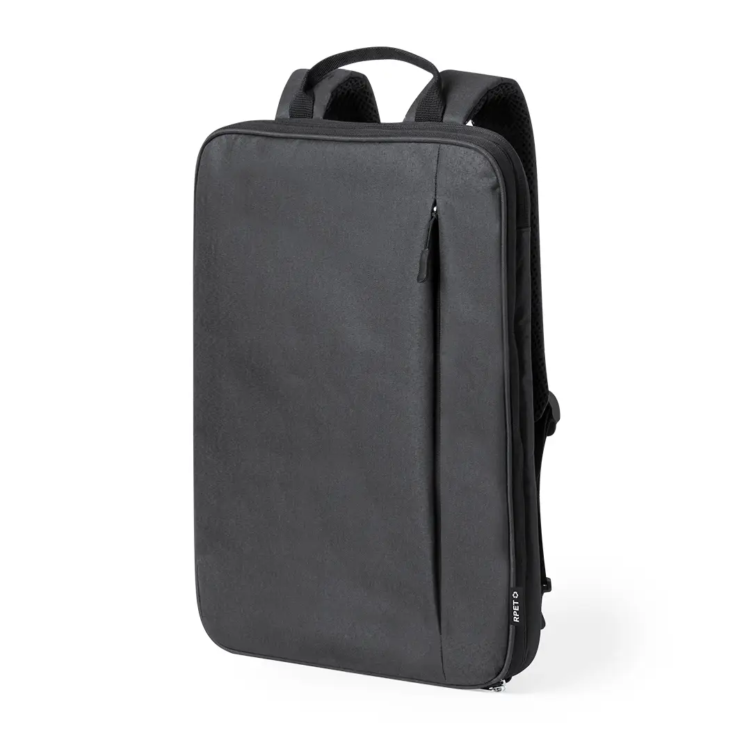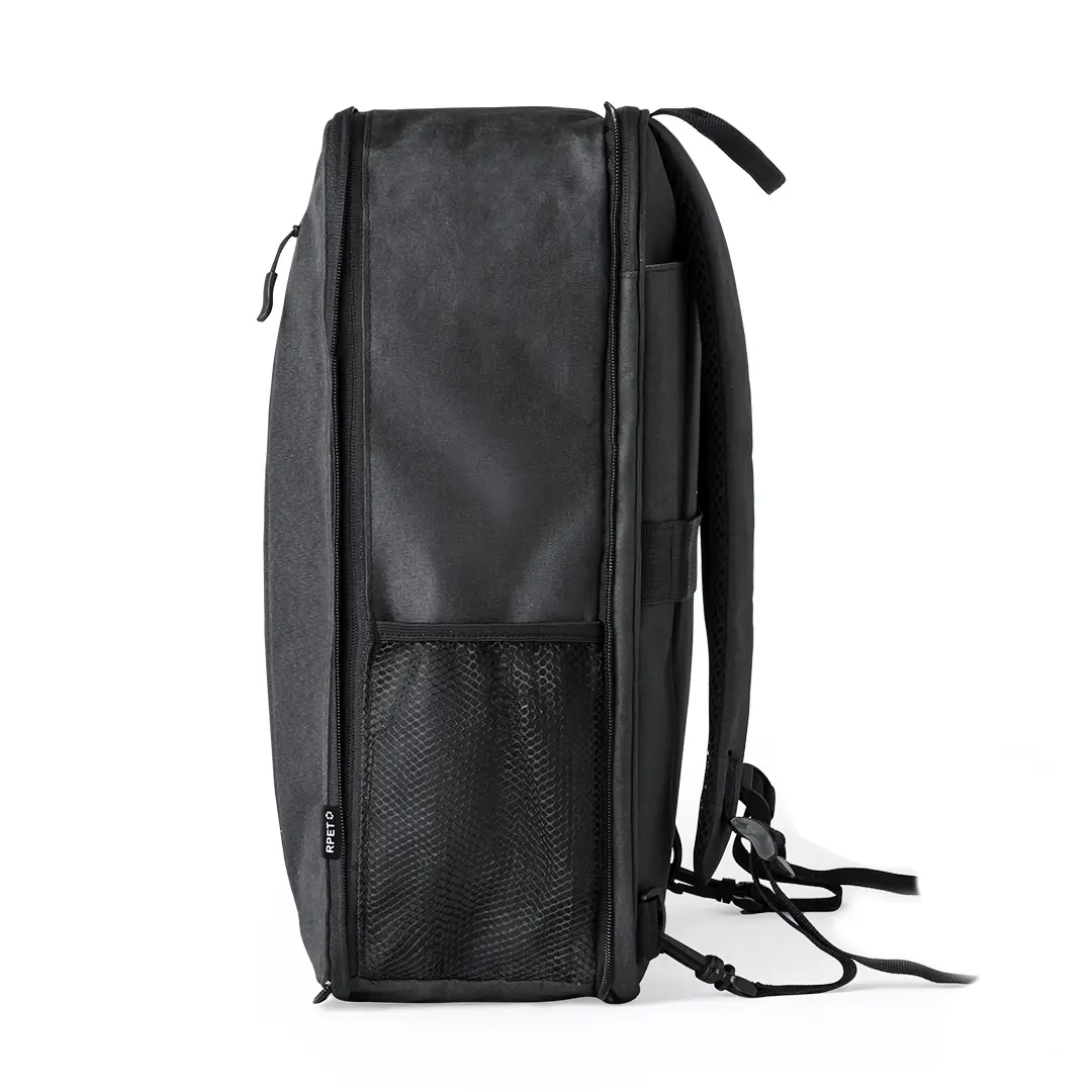 Mochila extensible confeccionada en resistente 600D RPET. Equipada con cierre de cremallera de doble tirador, con posibilidad para ampliar la capacidad. Su interior cuenta con compartimentos acolchados diseñados para tablet de hasta 10 pulgadas y portátil de hasta 15 pulgadas. Las cintas de hombros son acolchadas, ajustables y desmontables, permitiendo guardarlas en el bolsillo trasero. La mochila incluye una cinta para fijarla a las maletas y un asa superior para un fácil transporte en la mano. Logotipo RPET en etiqueta. Presentado en una bolsa individual reciclada. El material RPET se elabora a partir de plástico reciclado, para así fomentar la reutilización de residuos plásticos y ayudar a la sostenibilidad del planeta.