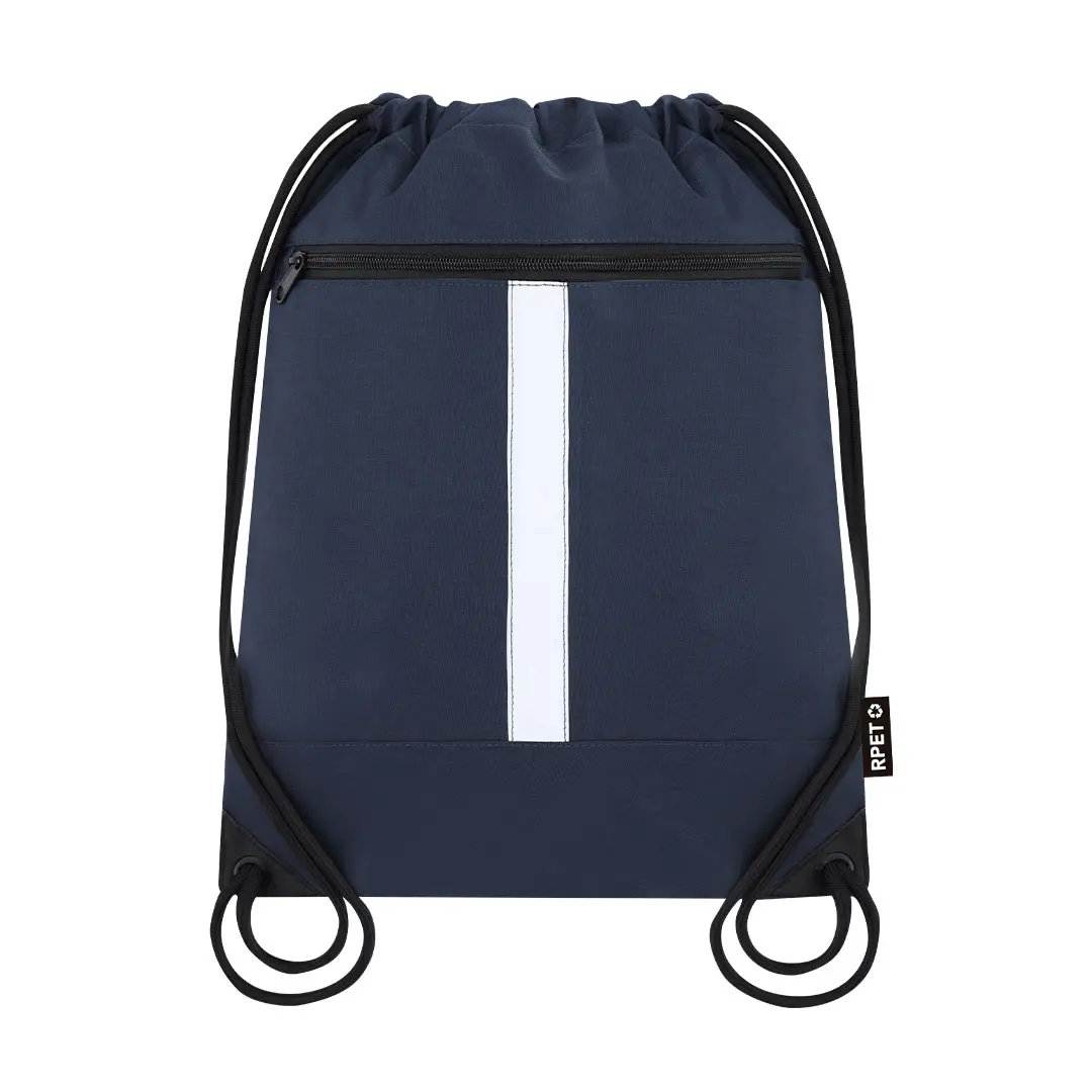 Mochila reflectante en Poliéster 300 RPET, con tira frontal reflectante. Cuenta con bolsillo en parte frontal. Cuerdas autocierre en color negro y esquinas reforzadas con argollas metálicas.