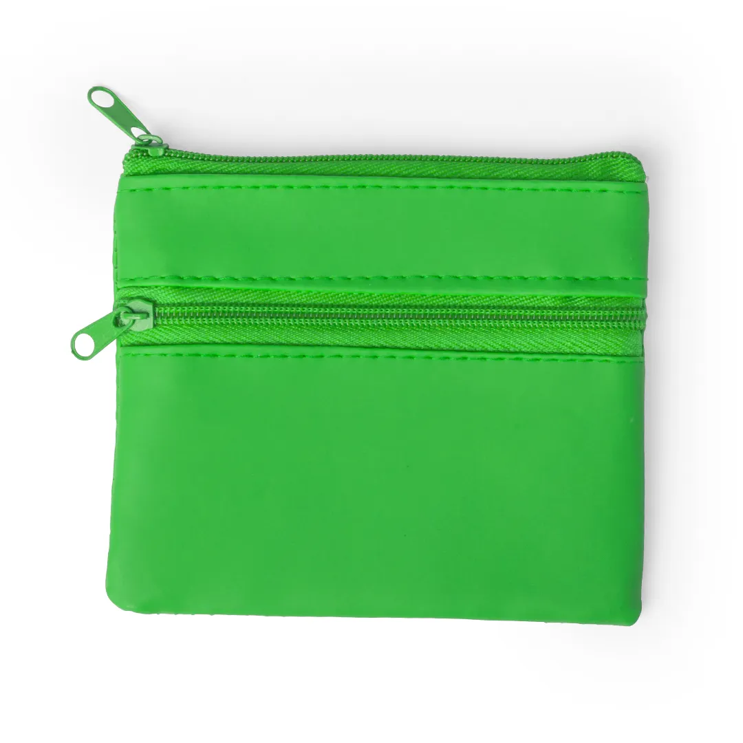 Monedero de alegre diseño con suave cuerpo acabado en brillante polipiel en variada gama de vivos colores. Compartimento principal y bolsillos frontal con cierre de cremallera a juego. Interior forrado a juego.