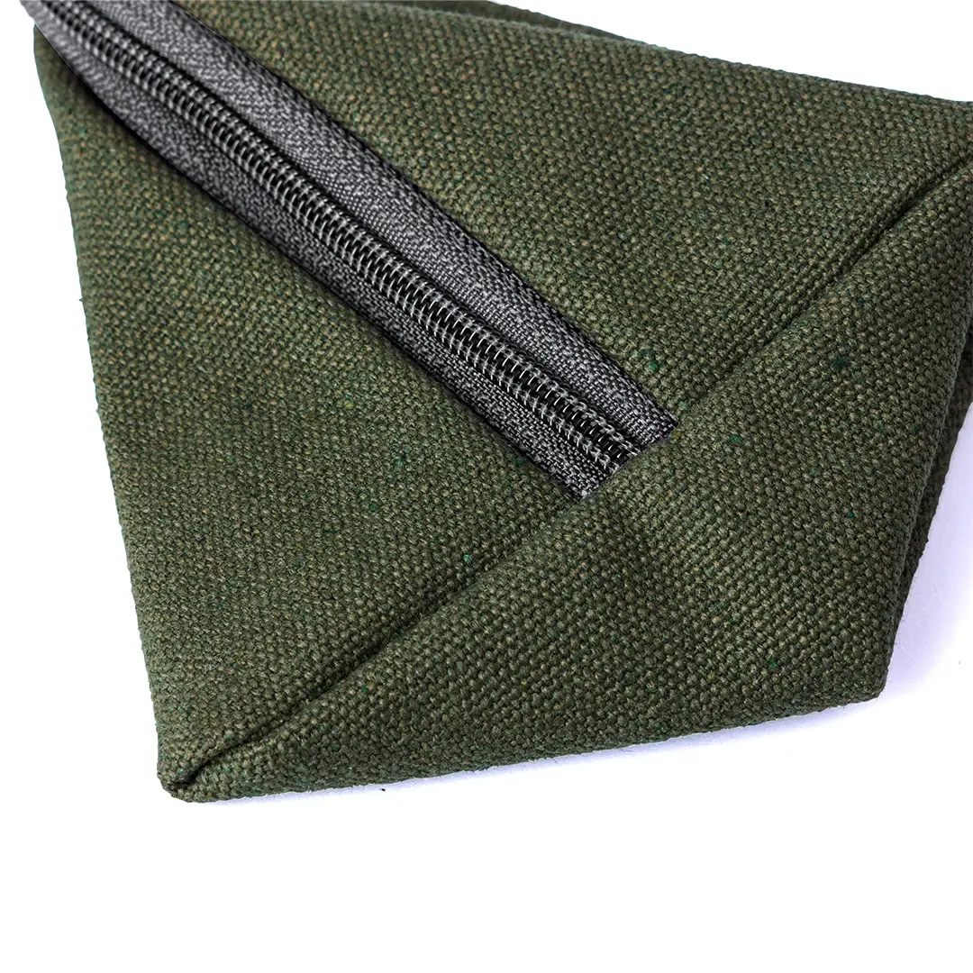 Original monedero en forma de pirámide, fabricado en resistente canvas. Bolsillo con cierre de cremallera y cinta de transporte larga. Disponible en varios colores.