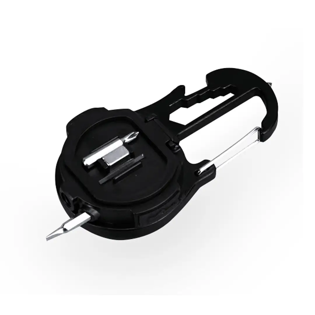 Práctica multiherramienta fabricada en resistente aluminio de acabado en negro y 12 funciones. Con linterna de 20 luces COB y 3 posiciones de iluminación: luz fija con dos grados de intensidad y luz intermitente; y alimentada por una batería de 500 mAh. Incluye llaves para tuercas hexagonales en varios tamaños, abridor, y martillo rompe cristales. Con función destornillador (incluidas puntas planas y philips) y un potente imán. Práctico mosquetón de enganche y soporte en la parte trasera. Con cable de carga incluido y presentado en caja de diseño kraft.
