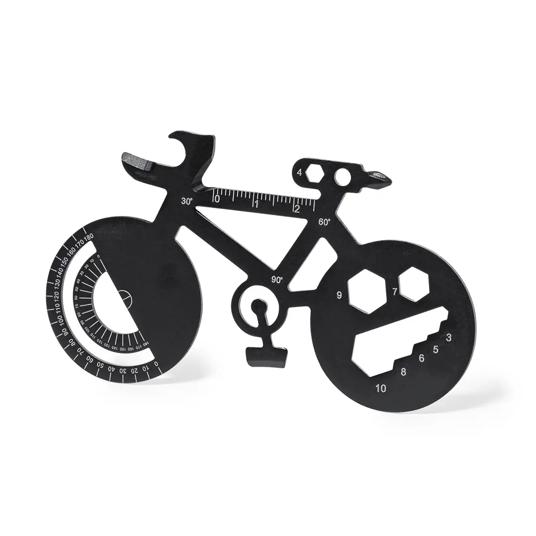 Original y práctica multiherramienta en acero inox con forma de bicicleta. Con 16 funciones, entre otras: destornillador de punta plana y philips, llave para tuercas hexagonales en varios tamaños, regla, transportador de ángulos y abrebotellas. Presentada en bolsa de papel reciclada.