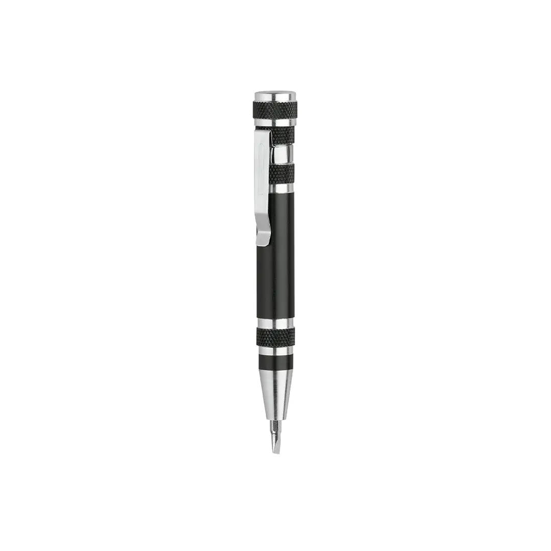 Multiherramienta de aluminio de 6 accesorios en variada gama de vivos colores metalizados. Con cuerpo anti deslizante y clip metálico. Incluye 6 cabezales destornilladores planos y de estrella.
