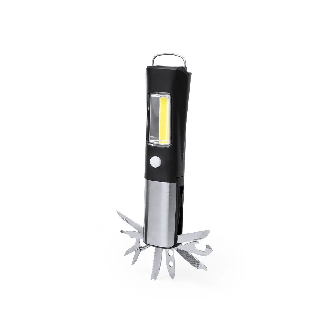 Práctica multiherramienta fabricada en resistente ABS y acero inox, con linterna frontal integrada de 1 LED. Incluye linterna lateral de 19 luces COB con dos posiciones de ilumincación (fija e intermitente). Dispone de 13 funciones, entre ellas cuchillo liso, de sierra, destornillador philips, tijeras, destornilladores planos, llave para tuercas hexagonales en varios tamaños, abrelatas, abrebotellas y una lima. Con imán de fijacion y asa. Alimentada con 3 pilas AAA, no incluidas. Presentada en caja de diseño kraft.