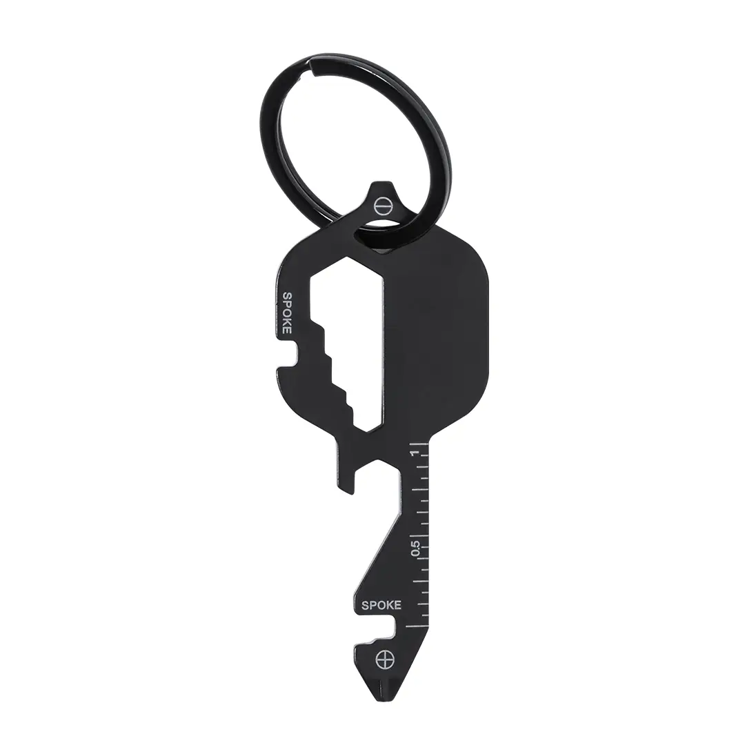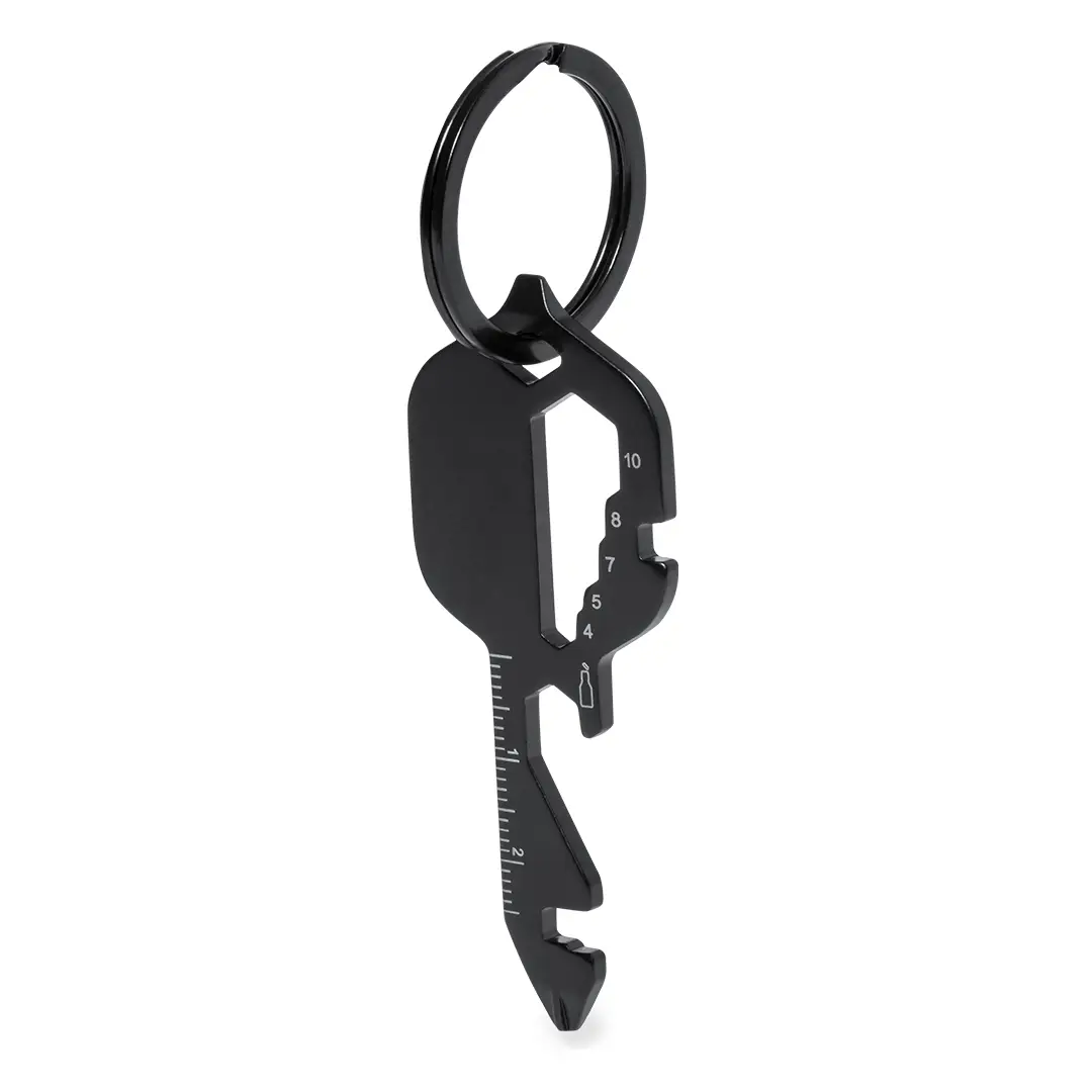 Original y práctica multiherramienta con llavero en acero inox. Con 13 funciones entre otras, destornillador de punta plana y philips, llave para tuercas hexagonales en varios tamaños, regla y abrebotellas. Presentado en sobre de cartón.