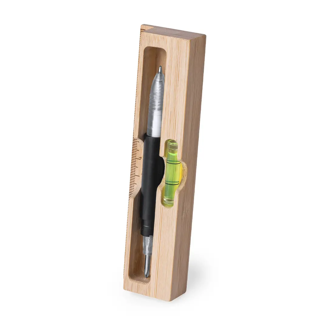 Práctica multiherramienta de 5 funciones, fabricada en resistente acero al carbono y acabado en color negro. Con funciones destornillador (punta plana y philips) y bolígrafo con tinta azul (cartucho jumbo). Presentada en resistente estuche de bambú, con nivel integrado y regla. Presentada individualmente en caja de diseño kraft.