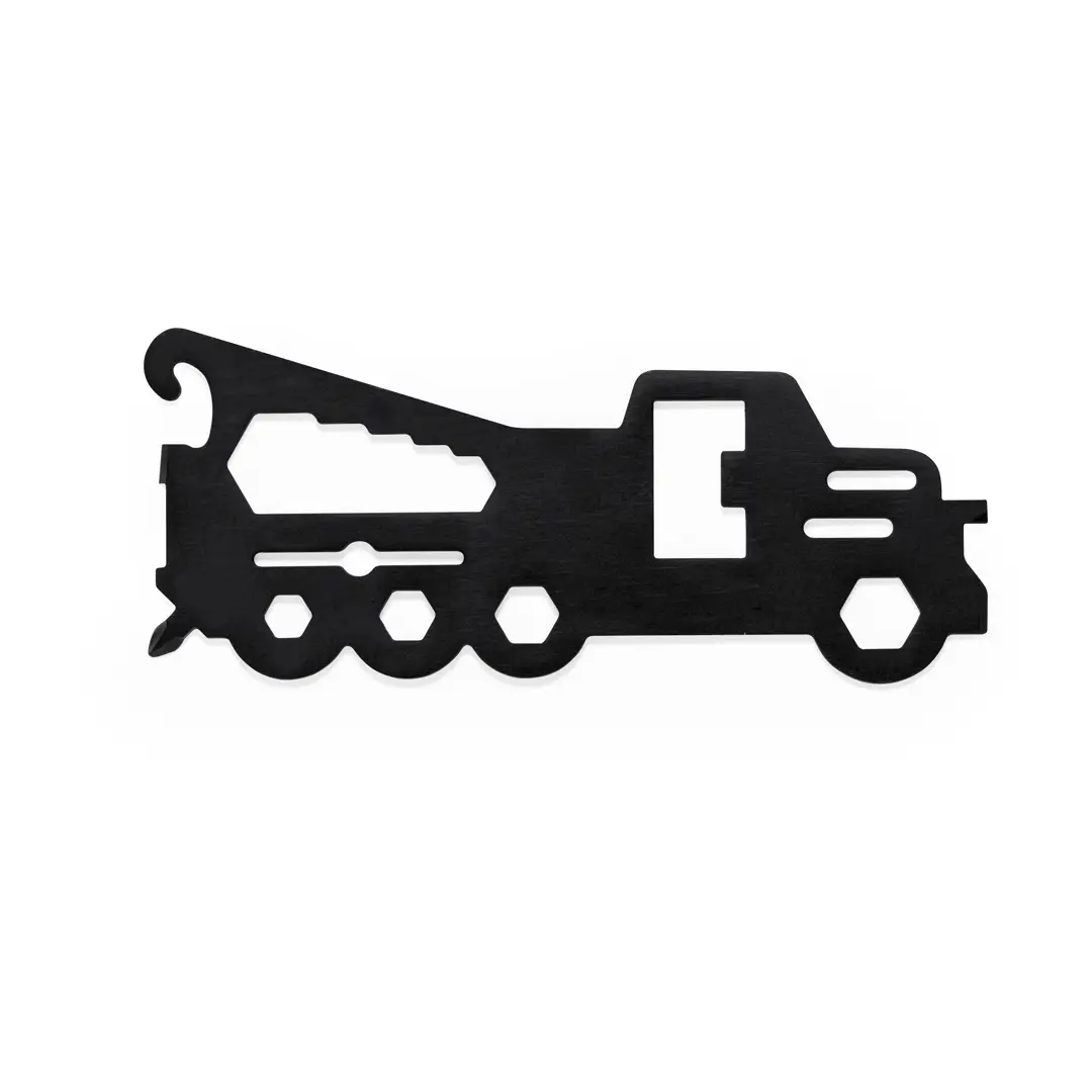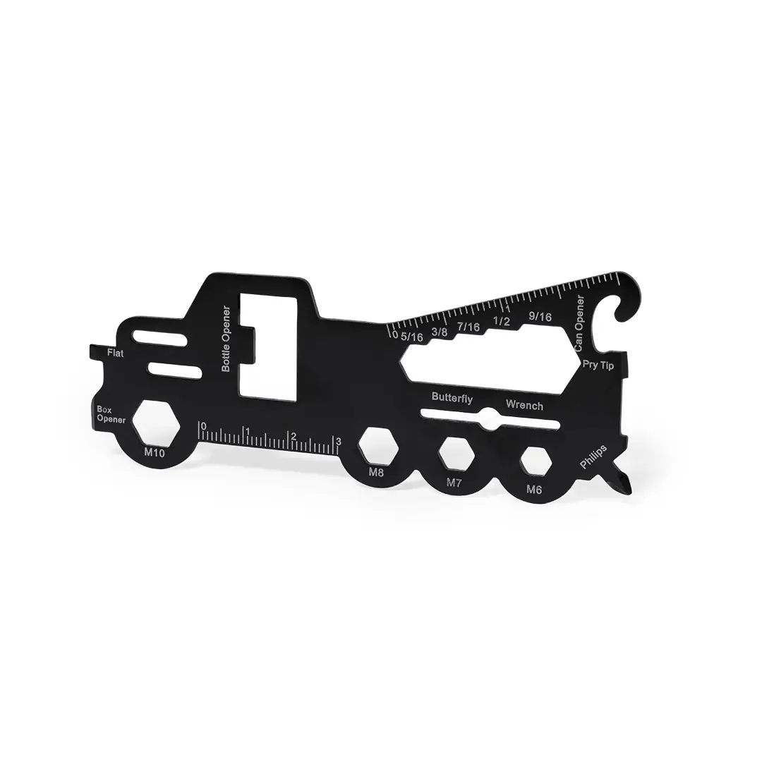 Original y práctica multiherramienta en acero inox con forma de camión. Con 18 funciones, entre otras: destornillador de punta plana y philips, llave para tuercas hexagonales en varios tamaños, regla, abridor de cajas y abrebotellas. Presentado en bolsa de papel reciclada.