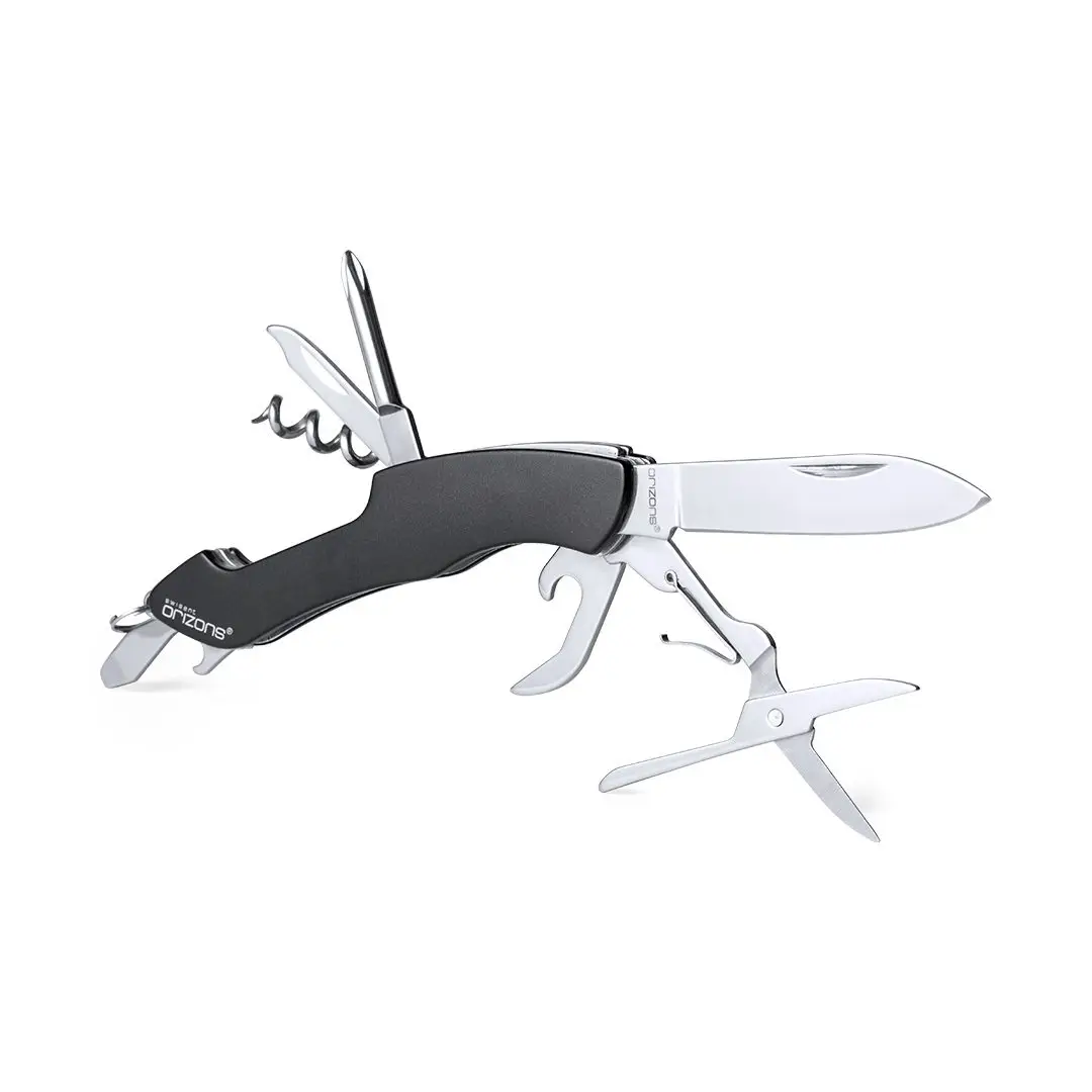 Navaja multiusos de orizons con accesorios de acero inox de 10 funciones y mango de aluminio en vivos colores. Con navaja, tijeras, abrelatas, abrebotellas con destornillador plano, destornillador de punta de estrella, punzón con lima y sacacorchos. Con anilla para llavero y presentada en atractiva caja de diseño con logotipo de la marca.