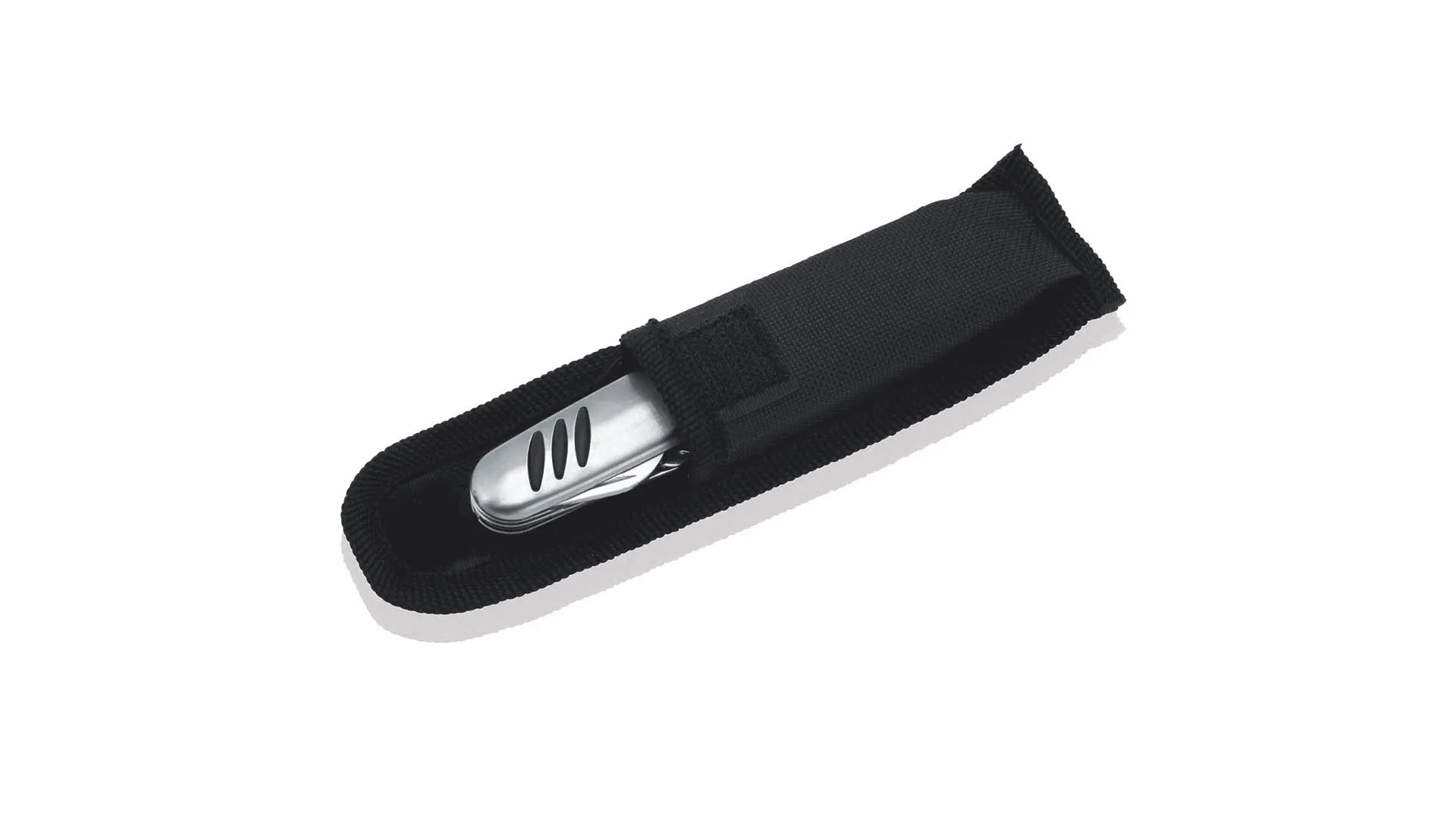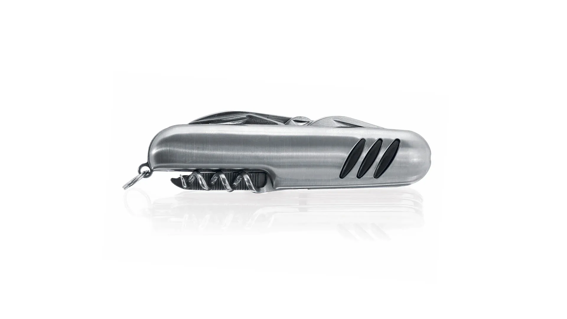 Navaja multiusos de acero inox de 10 funciones con empuñadura antideslizante. Incluye navaja, abridores, destornillador, lima, tijeras y anilla para llavero. Presentada en caja individual.