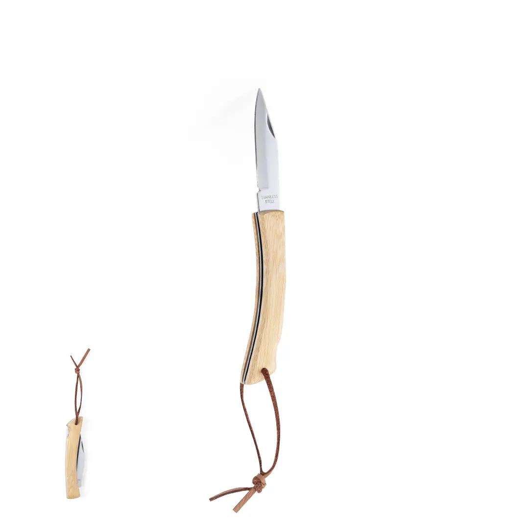 Navaja de línea nature con hoja de acero inox y resistente empuñadura de bambú con bloqueo de seguridad. Con cinta para transporte en polipiel y presentada en caja individual.