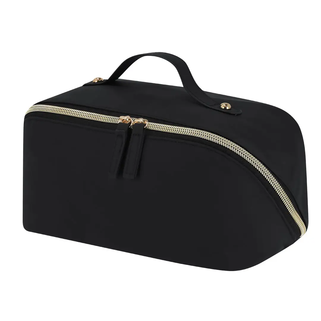 Neceser en suave PU, con compartimento principal de amplia apertura. Con tiradores de PU a juego y cremallera en color dorado. Interior con doble compartimento y bolsillo adicional con cremallera.