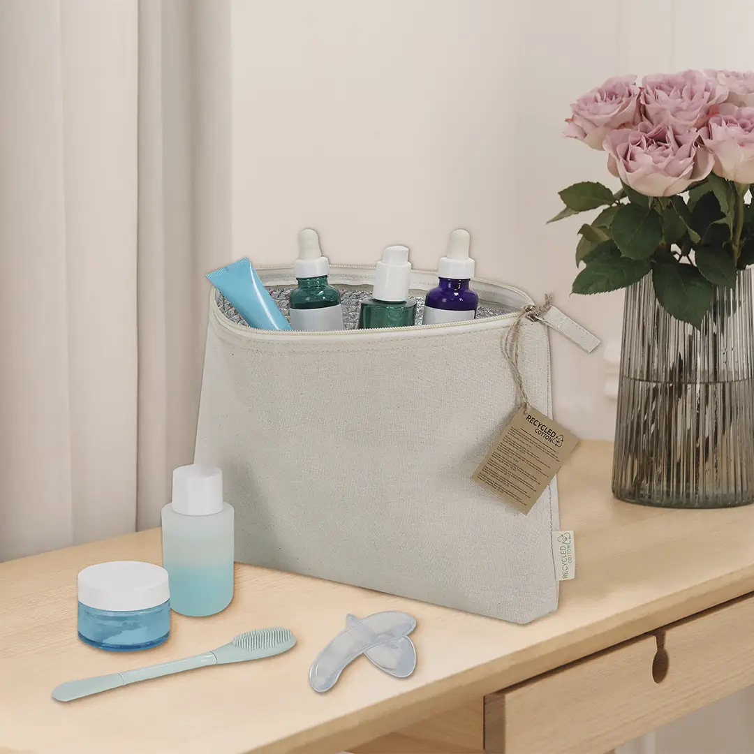 Neceser térmico elaborado principalmente en Algodón Reciclado 170 g/ m2 en elegante tono natural. Compartimento principal con cierre de cremallera, interior con forro isotérmico ideal para conservar tus productos cosméticos, y tirador en tono natural. Incluye etiqueta de Algodón Reciclado.