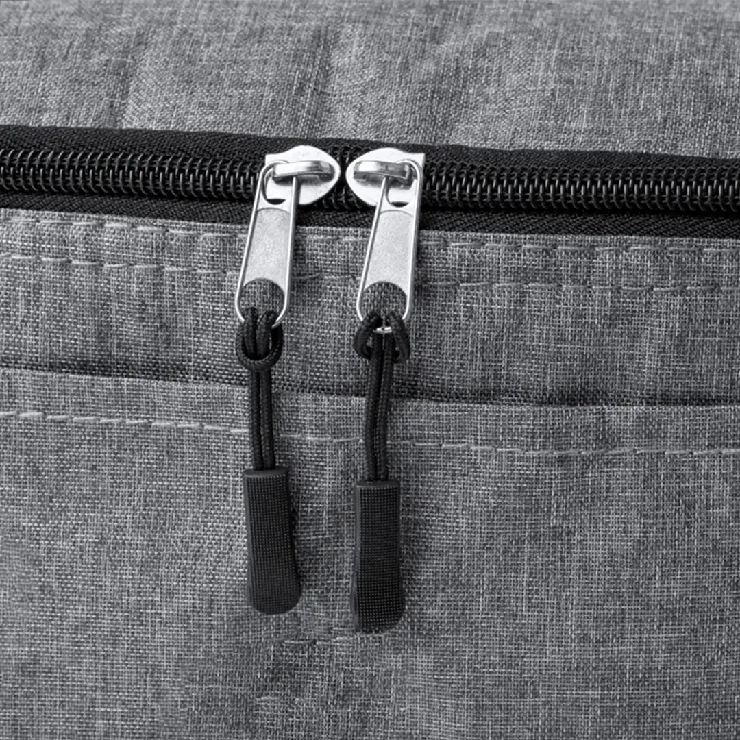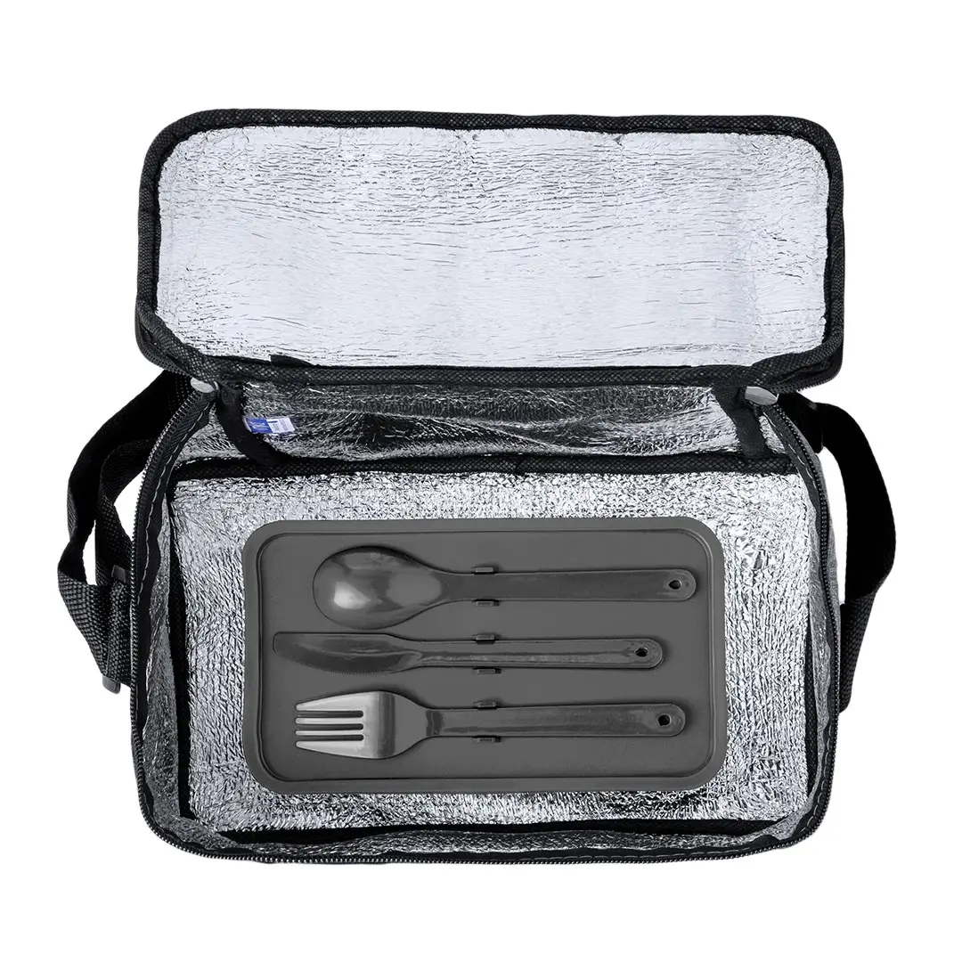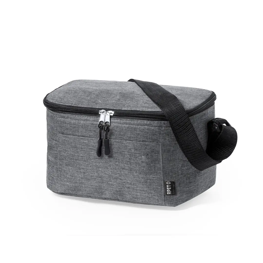 Nevera confeccionada en resistente poliéster 600D RPET con un atractivo efecto melange. Su compartimento principal cuenta con cierre de cremallera y forro interior de aluminio. Además, incorpora un práctico bolsillo exterior y una cinta bandolera ajustable, destacando el logotipo RPET en la etiqueta exterior. Incluye fiambrera con dos compartimentos de 700 ml y cubiertos fabricados en PP reciclado de color negro. Presentado de manera individual en una bolsa reciclada.El material RPET se elabora a partir de plástico reciclado, para así fomentar la reutilización de residuos plásticos y ayudar a la sostenibilidad del planeta.