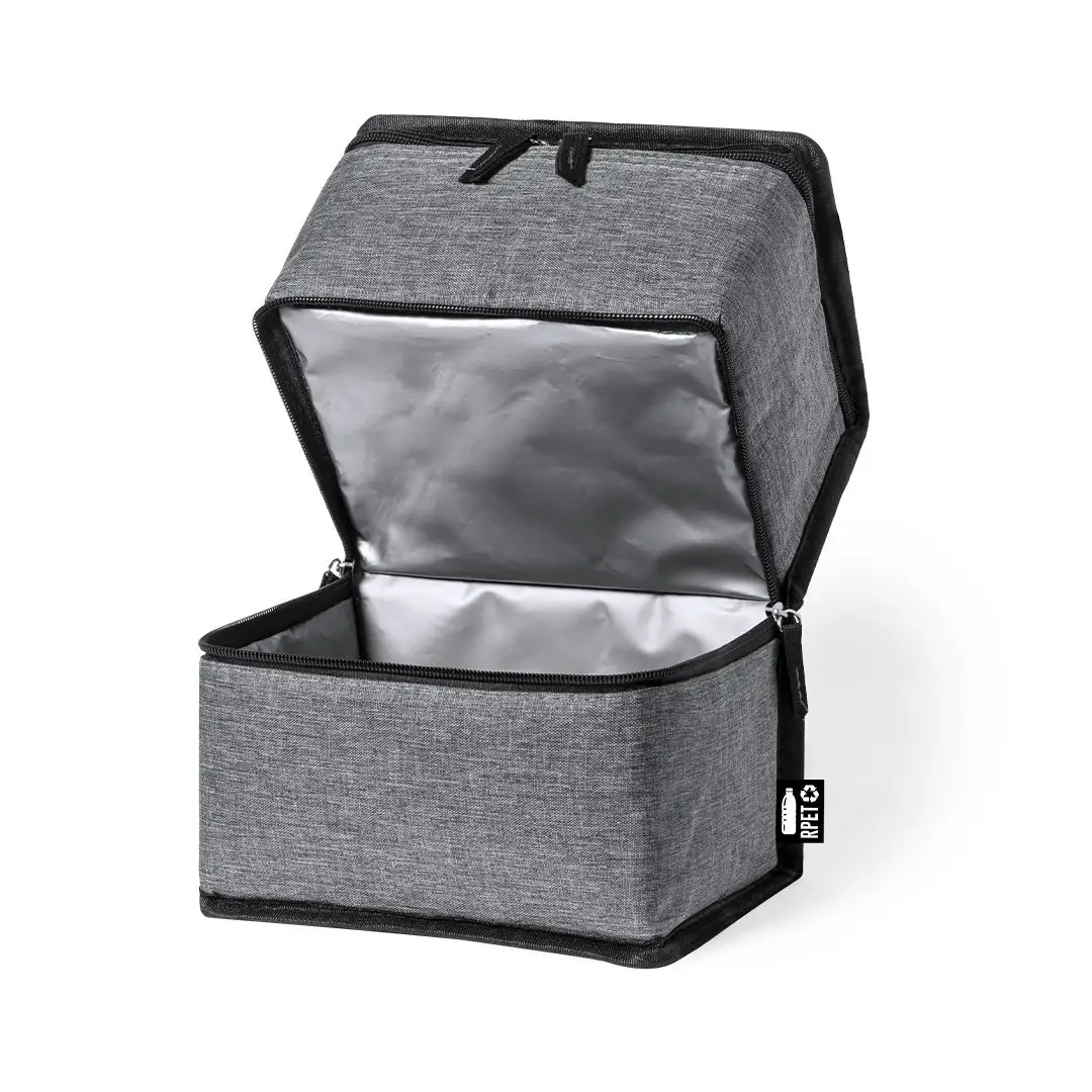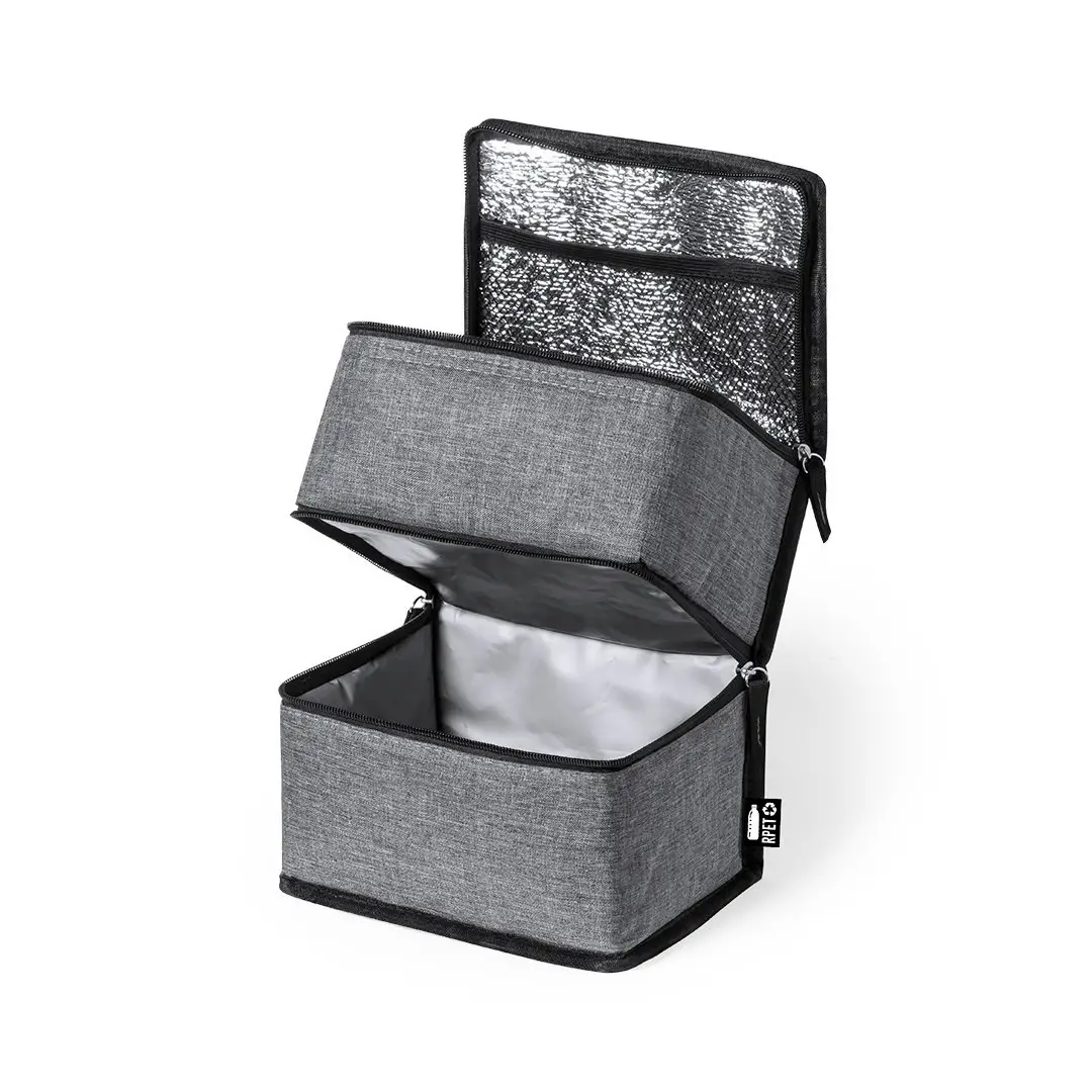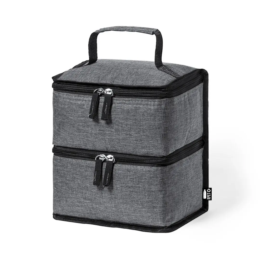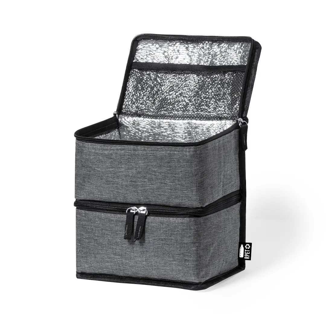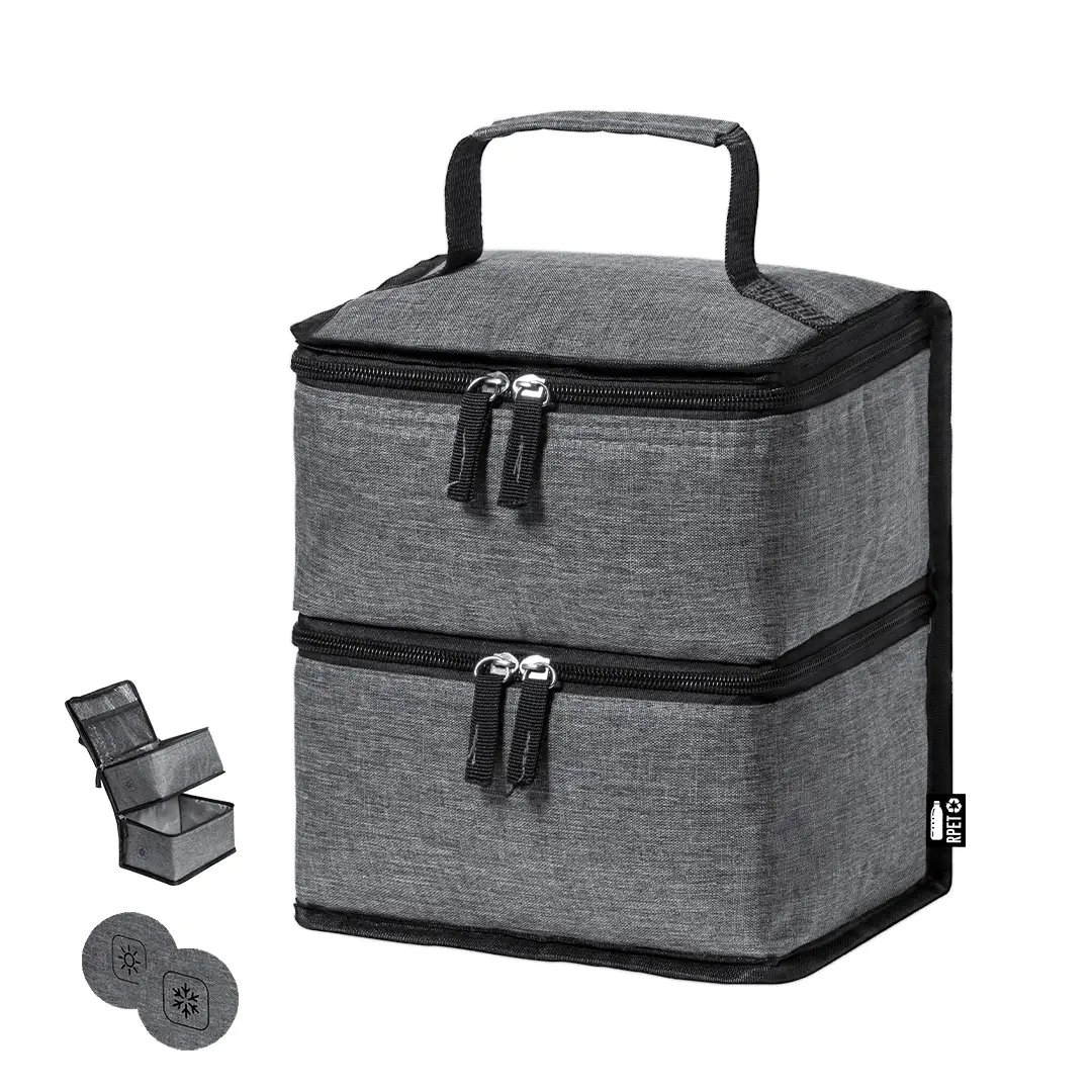 Práctica nevera de línea nature y doble compartimento fabricada en poliéster 600D RPET de alta calidad, elaborado a partir de plástico reciclado para así fomentar la reutilización de residuos plásticos y contribuir a la sostenibilidad del planeta. Asa de transporte reforzada, incluye 2 compartimentos con cierre de cremallera y doble tirador de tela, con distintivo RPET en etiqueta exterior: Compartimento superior diseñado para conservar el calor, con interior isotermo en aluminio. Compartimento inferior diseñado para conservar el frío, con interior isotermo en PEVA.