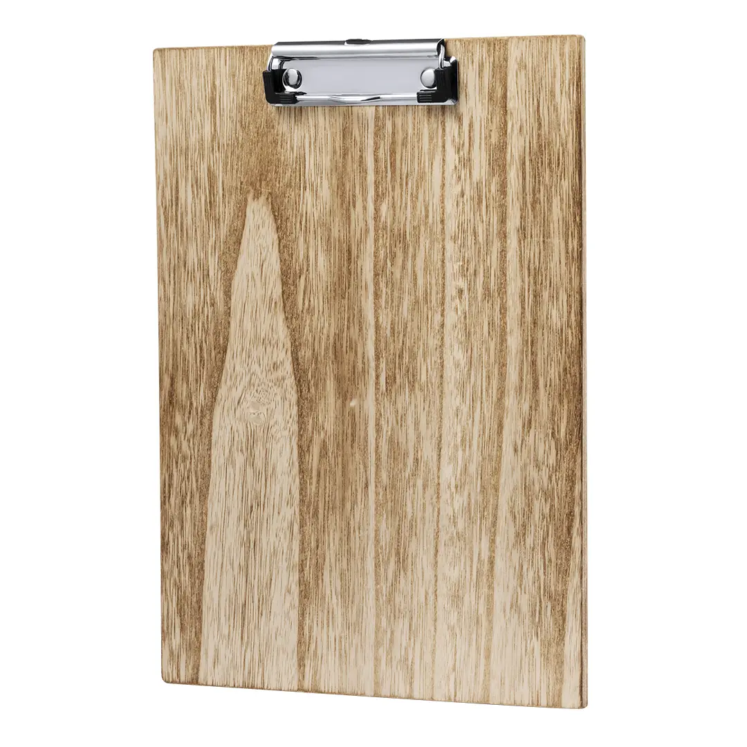 Excelente organizador en suave madera tamaño A4. Con resistente pinza para documentación y presentada individualmente en caja de diseño kraft.